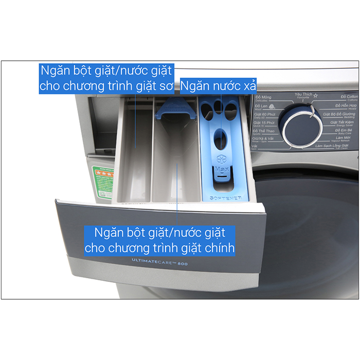 • Máy giặt cửa trước hiện đại lồng ngang • 15 chương trình giặt tự động tích hợp (ECO 40-60, Cotton, Cotton prewash, Cotton 20°C, Colours, Synthetics, Wool, Duvet, Rinse, Allergy Safe, Spin/Drain, Hand wash/Delicate,