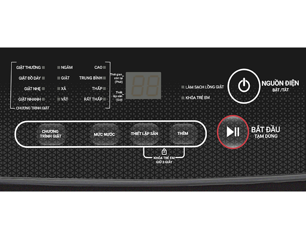 Tổng quan thiết kế - Kiểu dáng: máy giặt lồng đứng - cửa trên. - Bảng điều khiển: nút nhấn có màn hình hiển thị, sử dụng tiếng Việt đơn giản, dễ dùng. - Nắp máy: chất liệu kính