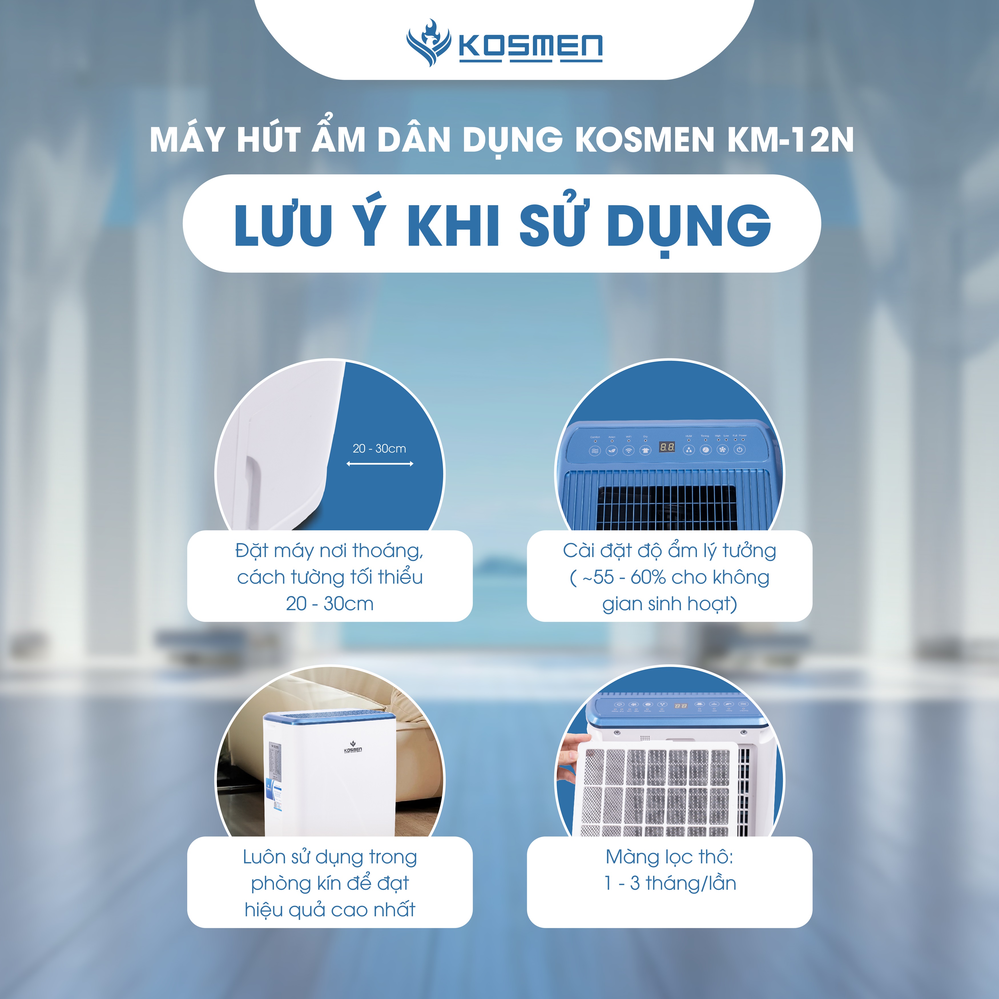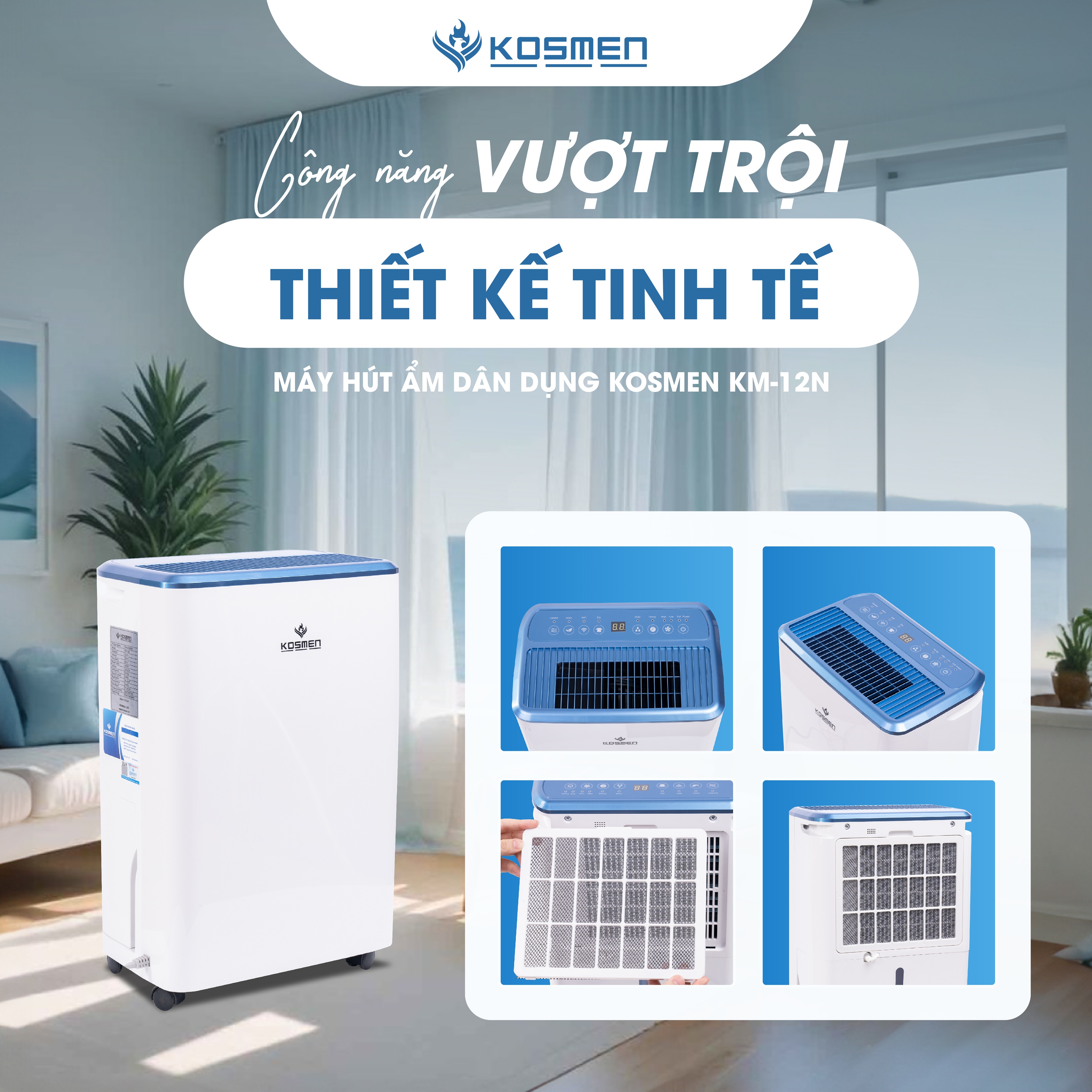 Máy hút ẩm lọc không khí Kosmen KM-12N là dòng sản phẩm nổi bật được nhiều khách hàng ưa chuộng bởi tính hữu dụng và độ bền bỉ, ứng dụng tốt trong cả không gian văn phòng lẫn nhà ở. Sở hữu nhiều tính năng thông minh cùng công suất hút ẩm vượt trội, máy hút ẩm Kosmen KM-12N đã trở thành người bạn đồng hành tuyệt vời cho hàng ngàn gia đình trong những ngày tiết trời giao mùa sắp tới.