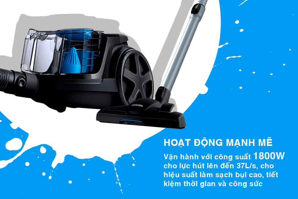 Máy vận hành với công suất 1800W, cho lực hút lên đến 37L/s, cho hiệu suất làm sạch bụi cao, tiết kiệm thời gian và công suất dọn dẹp nhà cửa của bạn. Các mức công suất có thể được điều chỉnh nhờ vào một phía bấm +, - để bạn tùy chỉnh phù hợp với nhu cầu khác nhau.