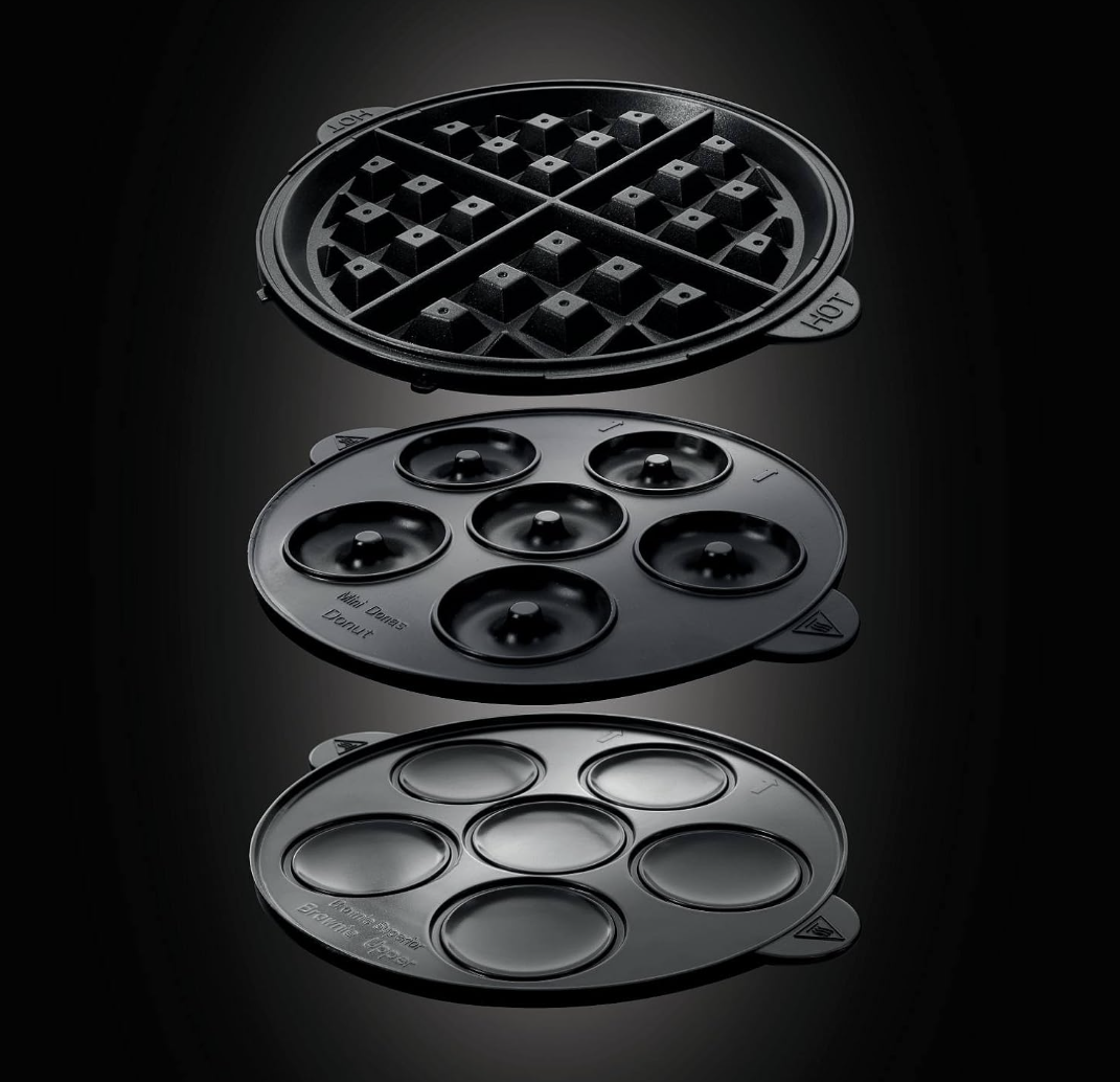 - Thiết bị đi kèm 3 cặp mặt đĩa: mặt đĩa làm waffle (4 cái), mặt đĩa làm donut (6 cái), mặt đĩa làm muffin (6 cái). Mặt đĩa có lớp chống dính, có thể rửa trong máy rửa chén, các mặt đĩa có thể tháo rời và có khóa tự động.