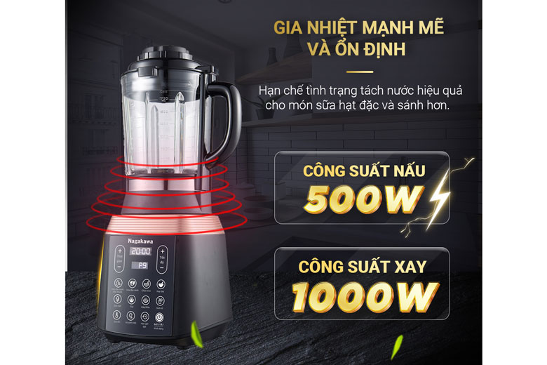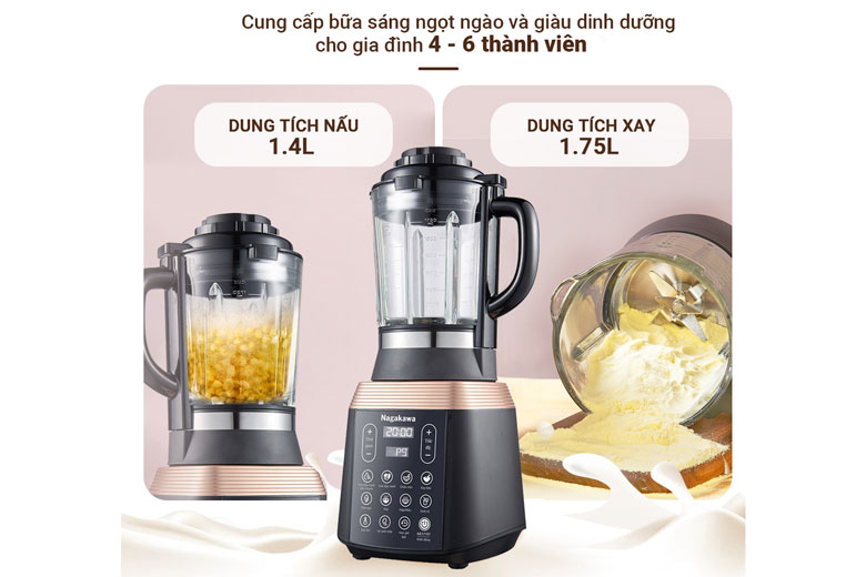 Máy làm sữa hạt Nagakawa NAG0815 Sữa hạt là một loại thực phẩm dinh dưỡng, giúp làm giảm cholesterol và nguy cơ ung thư. không chỉ giúp việc chế biến thức uống này nhanh chóng và dễ dàng mà còn giúp bạn chủ động hơn trong kiểm soát chất lượng nguyên liệu, thành phần; đem lại hiệu quả tốt hơn cho sức khỏe. Thiết kế sang trọng Nagakawa NAG0815 sở hữu thiết kế sang trọng với tông màu chủ đạo là đen cùng vàng đồng hiện đại. Cùng với thiết kế bắt mắt & kích thước nhỏ gọn, bạn có thể đặt máy làm sữa hạt đa năng trên kệ bếp mà không sợ tốn diện tích. Cung cấp bữa sáng cho đại gia đình NAG0815 có dung tích và công suất nấu đáp ứng cho gia đình từ 4 - 6 người.