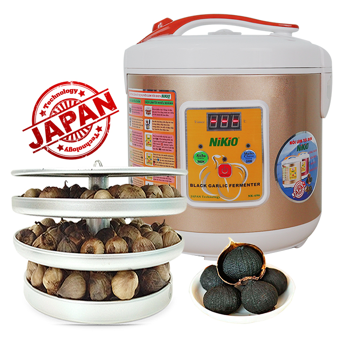 Máy làm tỏi đen Nhật Bản Nikio NK-696 - 6L, làm được 2kg tỏi, nồi làm tỏi đen chuyên dụng tỏi cô đơn và tỏi nhiều nhánh Bạn đang có nhu cầu tìm mua 1 chiếc nồi làm tỏi đen cho gia đình để có thể tự tay làm ra những sản phẩm chất lượng để chăm sóc sức khỏe và tiết kiệm chi phí, bạn có ý định mua nồi (máy) làm tỏi đen về làm tỏi đen bán trên mạng hay bán tại cửa hàng... Thì Nồi làm tỏi đen Nhật Bản Nikio NK-696, dung tích nồi lớn 6 lít và 3 tầng chứa tỏi, sẽ là lựa chọ hoàn hảo nhất cho bạn. Máy được lập trình theo tiêu chuẩn chất lượng Nhật Bản, có tỉ lệ lên men thành công đến 100%. Đặc biệt với công nghệ kiểm soát nhiệt và độ ẩm hoàn toàn tự động nên tỏi ra dẻo, ngọt, bùi và thơm và chất lượng tỏi thành phẩm đạt chuẩn tỏi đen Nhật Bản (ngon hơn khi dùng tỏi cô đơn làm). Chất lượng những củ tỏi đen được làm từ nồi làm tỏi đen Nikio NK-696 này luôn thơm ngon và tăng hàm lượng dinh dưỡng như các tỏi đen Hàn Quốc, Nhật Bản trên thị trường hiện nay. Máy còn trang bị thêm tính năng lưu chương trình nấu khi mất điện, giúp chất lượng tỏi làm ra luôn ổn định. Tính năng sấy khô tự động giúp cho tỏi ra khô và dẻo tự nhiên. Nồi rất tiết kiệm điện năng tổng công suất chỉ có 90W. Hãy sở hữu ngay 1 chiếc máy ủ tỏi đen Nikio NK-696, nồi có 3 màu Vàng Gold, Bạc và Đỏ Tím phù hợp với từng nhu cầu màu sắc khác nhau. Đặc điểm nổi bật của máy làm tỏi đen Nhật Bản Nikio NK-696:
