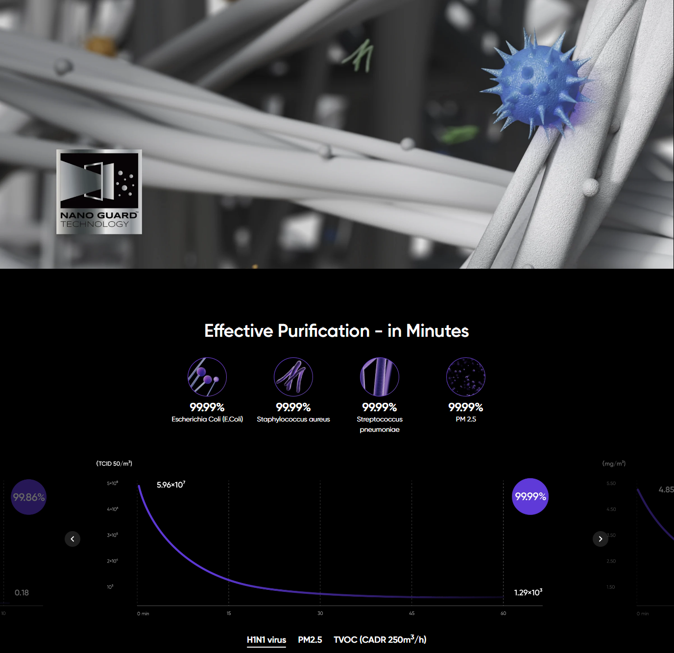 - Công nghệ NanoGuard độc quyền với hiệu suất lọc sạch lên tới 99,95%