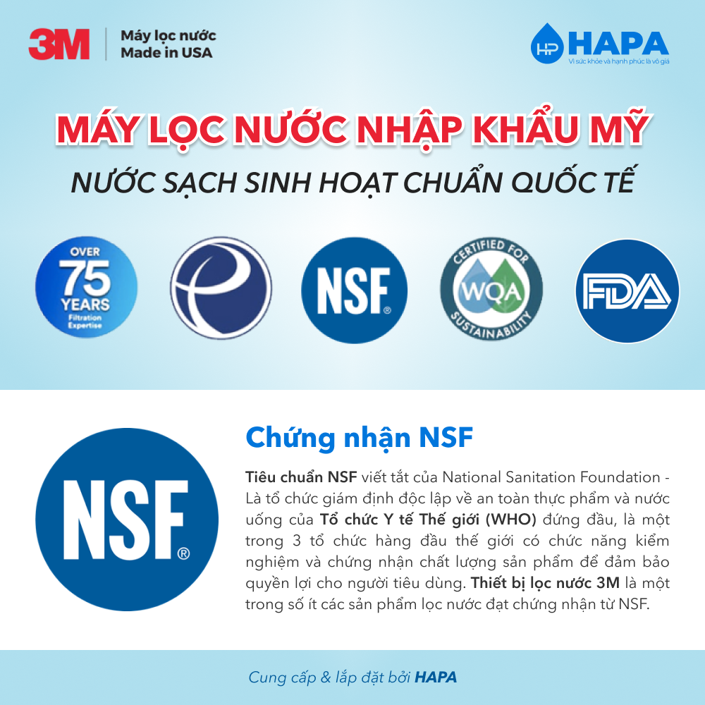 - Đạt các tiêu chuẩn chứng nhận quốc tế NSF, WQA, Viện Pasteur, Bộ Y Tế.