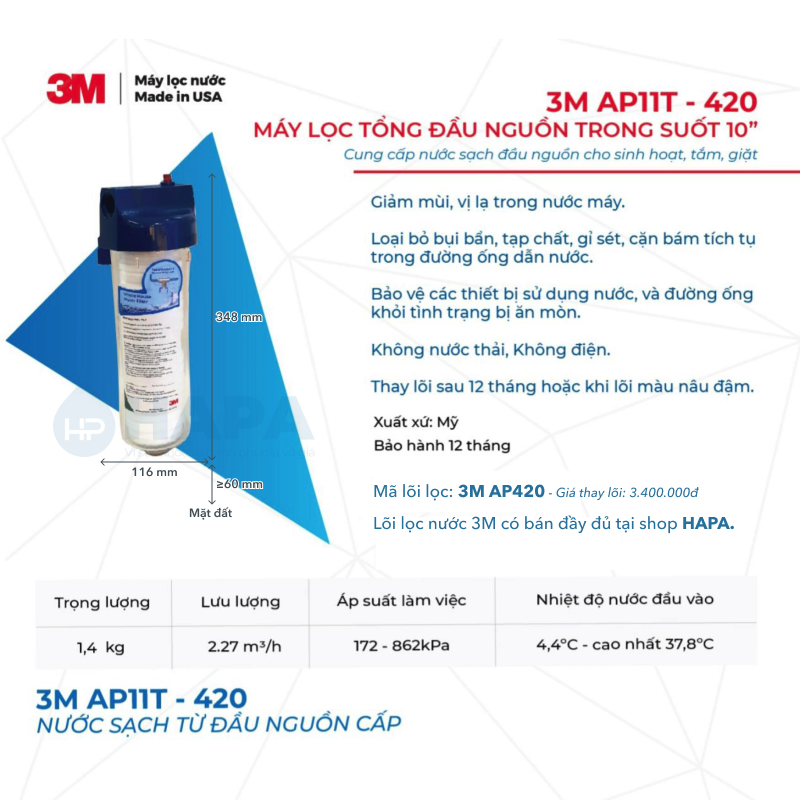 ✨Máy Lọc Nước Đầu Nguồn 3M AP11T-420 Sinh Hoạt Gia Đình Căn Hộ Chung Cư Nhà Phố - Hàng Chính Hãng 3M Mỹ