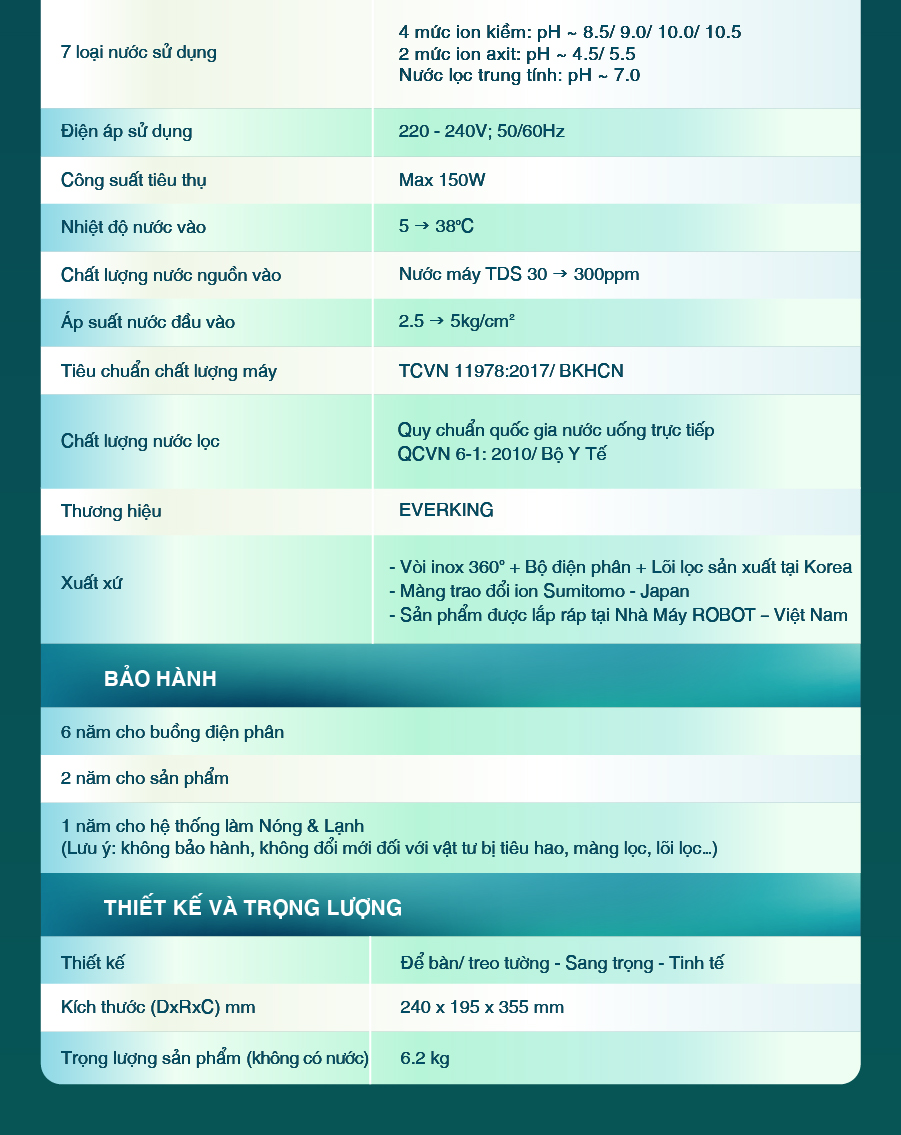 - EVERING EK-75, được trang bị bộ điện phân 5 tấm điện cực Titanium phủ Platinum nhập khẩu trực tiếp từ Hàn Quốc, bao gồm các tiêu chuẩn: