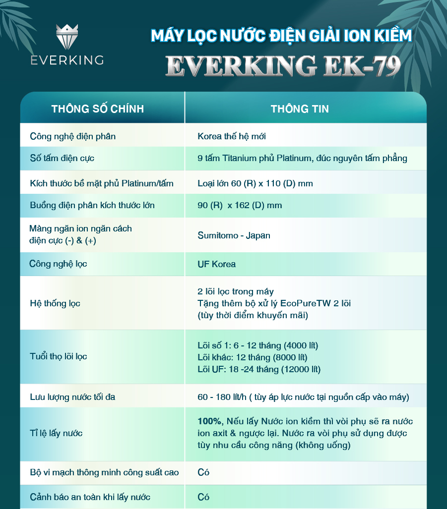 - EVERKING EK-79, được trang bị bộ điện phân 9 tấm điện cực Titanium phủ Platinum nhập khẩu trực tiếp từ Hàn Quốc, bao gồm các tiêu chuẩn: