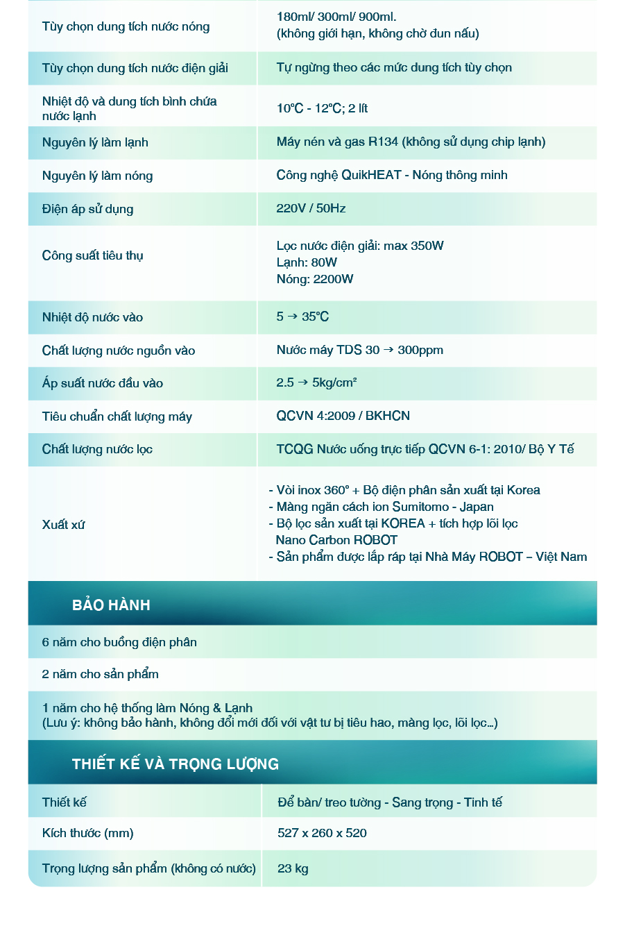 - Tạo đến 14 loại nước bổ ích: 11 loại nước điện giải + 3 loại nước Trung tính (nước Nóng 4 mức nhiệt độ + Nguội + Lạnh).
