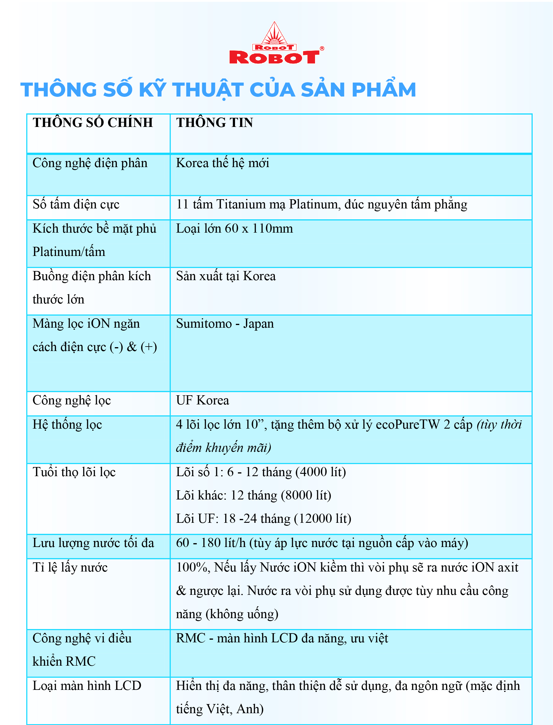 - Hệ thống điều khiển cảm ứng trên mặt phủ kính với màn hình LCD tinh tế ️ + Với mong muốn nhiều gia đình Việt có thể sử dụng nước điện giải iON kiềm với chi phí hợp lý để bảo vệ sức khỏe, sắc đẹp & nâng cao chất lượng cuộc sống, ROBOT mang đến sản phẩm “Chất lượng Quốc tế - Giá thành Việt Nam”, phù hợp với mức sống của nhiều người. Tiết kiệm cho người tiêu dùng đến hơn một nửa chí phí so với máy nhập khẩu chỉ từ 30 – 50%, nhưng sở hữu nhiều ưu điểm, tính năng vượt trội, chất lượng cao. ️ + Chế độ bảo hành chính hãng, tận nơi, vật tư và linh kiện, lõi lọc luôn có sẵn hạn chế tối đa chi phí sửa chữa, bảo trì. VĐV Cầu Lông Nguyễn Tiến Minh – tay vợt từng đứng Top 5 Thế Giới chia sẻ: Sau một thời gian sử dụng Máy lọc nước điện giải iON kiềm Minh thấy cải thiện sức khỏe rất nhiều và tốc độ hồi phục sau tập luyện, thi đấu cũng nhanh hơn so với trước đây. Bây giờ mỗi khi đi tập, hay khi đi thi đấu, Minh đều mang theo nước iON kiềm để uống. ROBOT là một thương hiệu Việt Nam uy tín nên Minh hoàn toàn tin tưởng và lựa chọn Máy lọc nước điện giải iON kiềm ROBOT. ️Thông Tin Thương Hiệu CÔNG TY CỔ PHẦN ĐẦU TƯ ROBOT