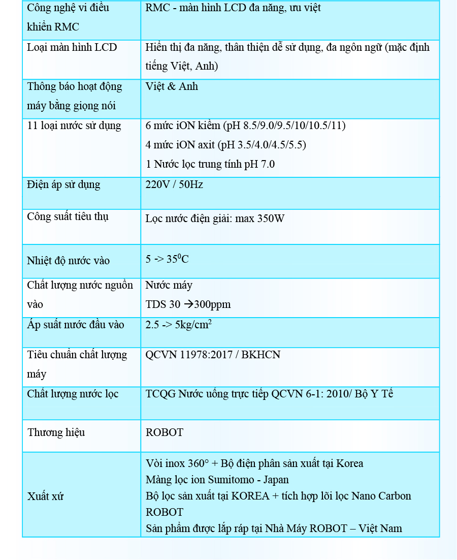 - Và 4 mức nước iON axit (pH 3.5/4.0/4.5/5.5). Chất lượng nước đạt chỉ số tối ưu, nồng độ Hydro hoạt tính lên đến ~ 1500 -> 1800 ppb, chống oxy hóa (ORP) lên đến ~ -850 -> -1000 mV, đáp ứng mọi nhu cầu sử dụng trong cuộc sống. Máy lọc nước điện giải iON kiềm ROBOT ionPrince được thiết kế kiểu dáng hiện đại, thiết kế chinh phục mọi không gian. Đặc biệt, bộ sưu tập 5 sắc màu pastel hiện đại đáp ứng mọi sở thích và phong cách nội thất, chắc chắn sản phẩm sẽ là điểm nhấn đặc sắc trong ngôi nhà của bạn. Chỉ số Hydrogen, ORP của nước tùy thuộc số tấm điện cực, đặc tính nguồn nước & “điều kiện đo trong phòng thí nghiệm chuyên nghiệp, đạt chuẩn”. +++ Máy lọc nước điện giải iON kiềm ROBOT ionPrince 1111, tạo 11 loại nước bổ ích, pH 3.5 --> 11.0 - Đáp ứng mọi nhu cầu trong cuộc sống Có thể tham khảo ý kiến của Bác sĩ hoặc chuyên gia dinh dưỡng để được hướng dẫn loại nước uống phù hợp nhất cho cơ thể. Kiểu dáng hiện đại - Thiết kế chinh phục mọi không gian