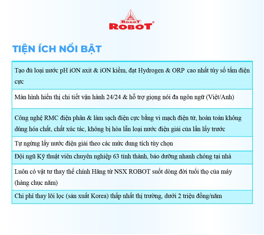 - Với mong muốn nhiều gia đình Việt có thể sử dụng nước điện giải iON kiềm với chi phí hợp lý để bảo vệ sức khỏe, sắc đẹp & nâng cao chất lượng cuộc sống, ROBOT mang đến sản phẩm “Chất lượng Quốc tế - Giá thành Việt Nam”, phù hợp với mức sống của nhiều người. Tiết kiệm cho người tiêu dùng đến hơn một nửa chí phí so với máy nhập khẩu chỉ từ 30 – 50%, nhưng sở hữu nhiều ưu điểm, tính năng vượt trội, chất lượng cao.