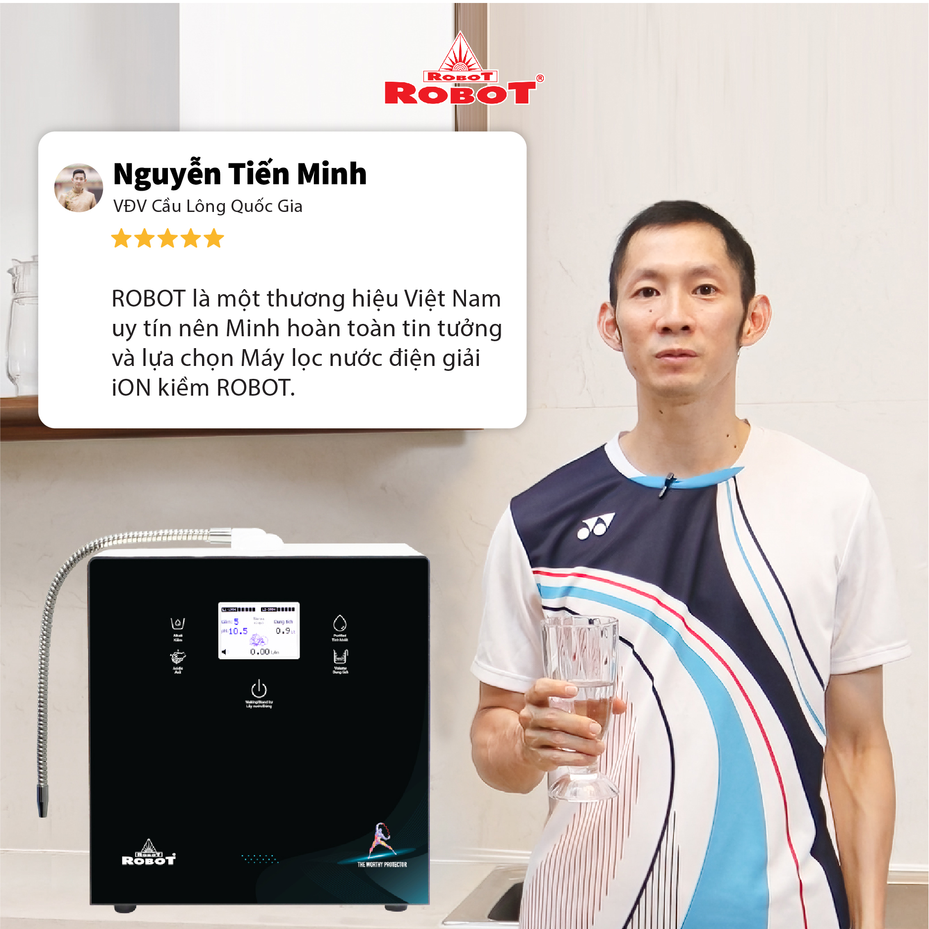 - Chế độ bảo hành chính hãng, tận nơi, vật tư và linh kiện, lõi lọc luôn có sẵn hạn chế tối đa chi phí sửa chữa, bảo trì. VĐV Cầu Lông Nguyễn Tiến Minh – tay vợt từng đứng Top 5 Thế Giới chia sẻ: Sau một thời gian sử dụng Máy lọc nước điện giải iON kiềm Minh thấy cải thiện sức khỏe rất nhiều và tốc độ hồi phục sau tập luyện, thi đấu cũng nhanh hơn so với trước đây. Bây giờ mỗi khi đi tập, hay khi đi thi đấu, Minh đều mang theo nước iON kiềm để uống. ROBOT là một thương hiệu Việt Nam uy tín nên Minh hoàn toàn tin tưởng và lựa chọn Máy lọc nước điện giải iON kiềm ROBOT. ️Thông Tin Thương Hiệu CÔNG TY CỔ PHẦN ĐẦU TƯ ROBOT