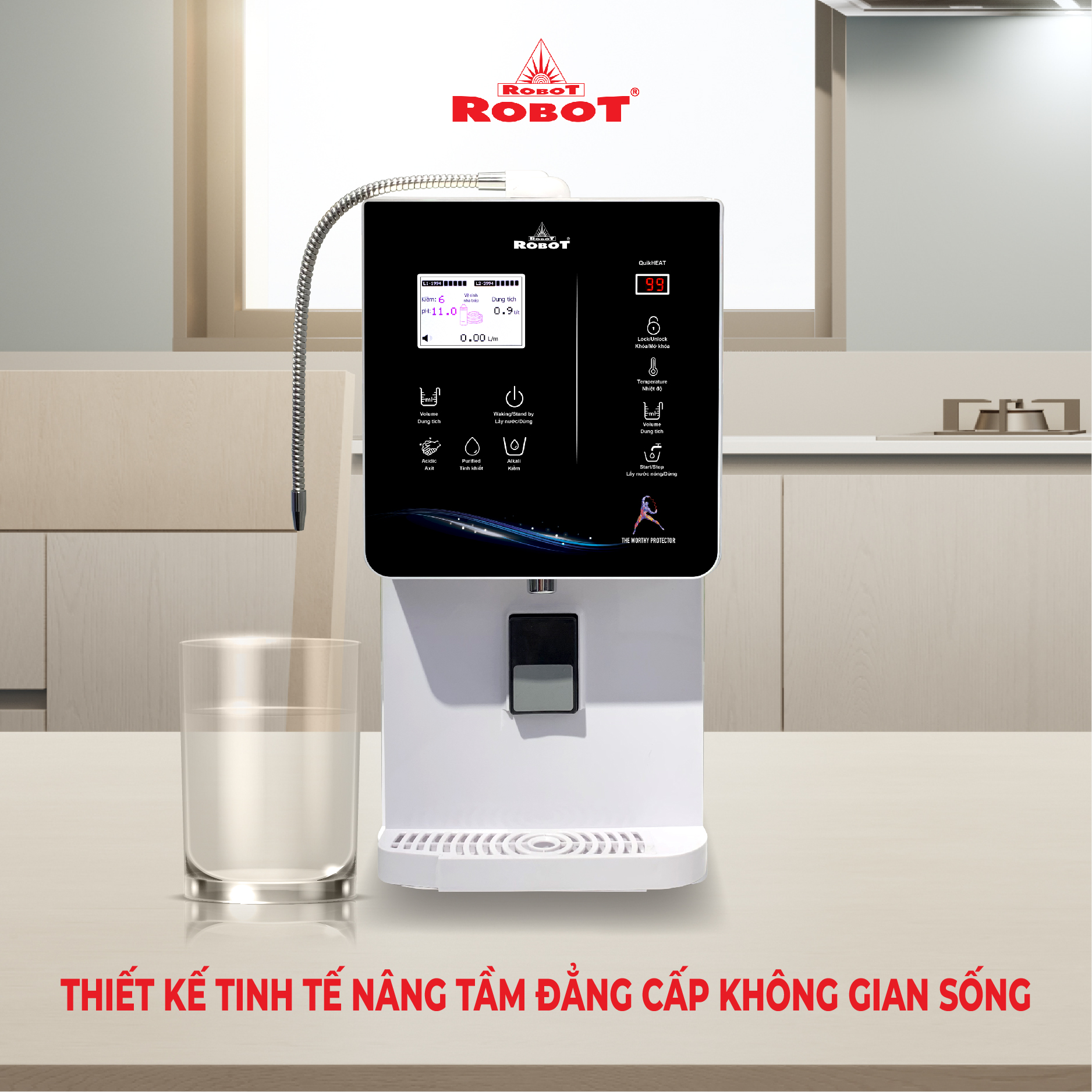 - Máy lọc nước điện giải iON kiềm Nóng Lạnh ROBOT ionQueen là dòng Để Bàn đầu tiên trên thế giới, được thiết kế kiểu dáng hiện đại, thiết kế chinh phục mọi không gian. Đặc biệt, được tích hợp thêm chức năng Nóng Thông Minh – Lạnh độc đáo & duy nhất trên thị trường, mang lại nhiều tiện ích cho người dùng.