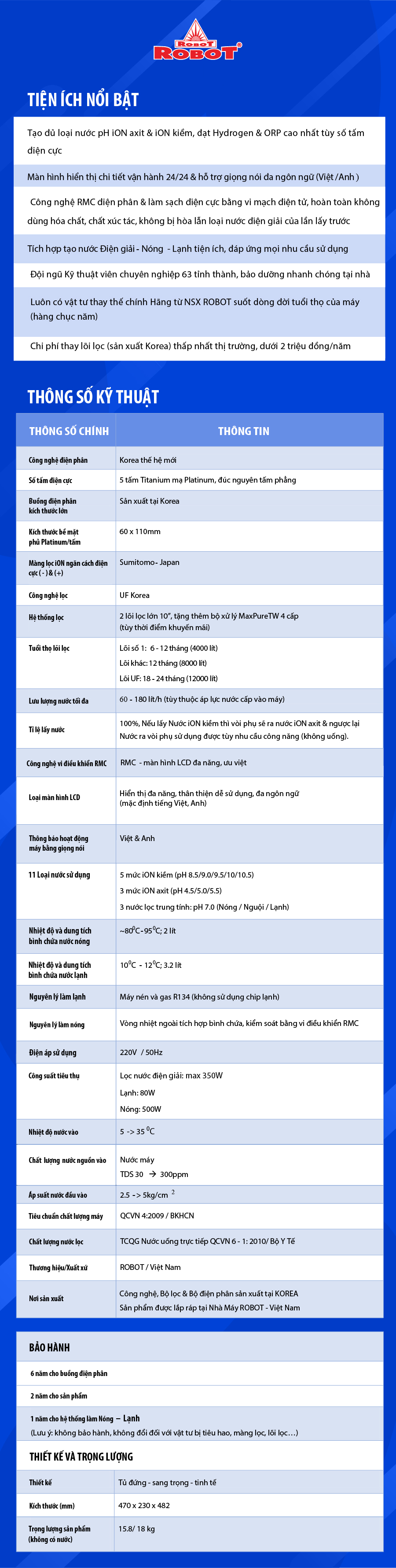 Máy lọc nước điện giải iON kiềm ROBOT UHC 4511 là model đặc biệt sản xuất với công nghệ tiên tiến hàng đầu thế giới, trang bị 5 tấm điện cực lớn nhất, có khả năng tạo ra đến 11 loại nước đa chức năng, với 5 mức nước iON kiềm (pH 8.5 - 10.5), nước lọc trung tính - Nóng - Lạnh (pH 7.0) & 3 mức nước iON axit (pH 4.5 - 5.5), có thể điều chỉnh, thay đổi tùy theo đặc tính nguồn nước tại nơi lắp đặt. Với nồng độ Hydro hoạt tính lên đến ~ 750 -> 850 ppb, chống oxy hóa (ORP) lên đến ~ -350 -> -500 mV, đáp ứng mọi nhu cầu sử dụng trong cuộc sống.
