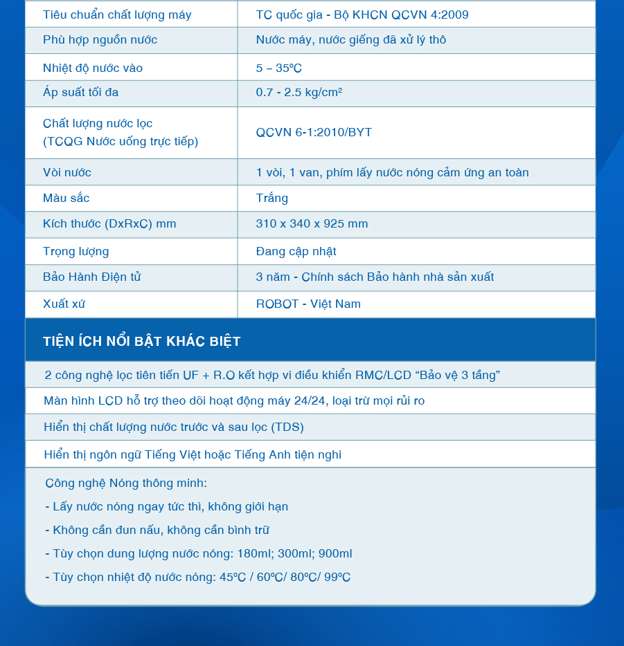Tổng quan - Kiểu lắp đặt:Tủ đứng - Loại máy:Máy lọc nước RO nóng nguội lạnh - Công nghệ lọc:Thẩm thấu ngược RO - Kháng khuẩn:Nano Silver - Dung tích bình chứa:Tổng 7.8 lít (Nước nóng 0.8 lít, nước lạnh 1 lít, nước thường 6 lít) - Tỷ lệ lọc - thải:Lọc 4.8 - Thải 5.2 (Tỷ lệ này phụ thuộc vào chất lượng nước đầu vào) - Công suất lọc:18 lít/giờ - Công suất tiêu thụ điện trung bình khoảng:0.628 kW/h - Nhiệt độ nước hãng công bố:Nóng 80 - 90°C, Lạnh 10°C - Nhiệt độ nước thực tế:Nóng 80 - 90°C, Lạnh 10°C - Áp lực nước yêu cầu:0.07 - 0.25 MPa - Nơi sản xuất máy bơm:Trung Quốc - Năm ra mắt:2023 - Thương hiệu:Việt Nam - Nơi sản xuất:Việt Nam Thông tin lõi lọc - Số lõi lọc:10 lõi -