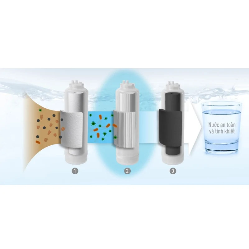 Mua tại TiktokNước an toàn cho nhiều mục đích sử dụng khác nhau Không chỉ để uống, mà còn cho nhiều mục đích sử dụng khác nhau như rửa tay và nấu ăn, nước sạch và an toàn là nhu cầu hàng ngày của mọi người. Khả năng lọc nước triệt để giúp bạn tận hưởng một cuộc sống không nổi lo. Hệ thống lọc 3 lõi tạo ra nước an toàn và tinh khiết Ba lõi lọc khác nhau giúp loại bỏ hoàn toàn các chất độc hại. Nhờ màng UF, vi khuẩn và thậm chí cả vi-rút đều được loại bỏ. Các vật liệu lọc là 1. PP: Polypropylene bông nén 2. UF: Màng siêu lọc sợi rỗng 3. CB: Khối than hoạt tính nén.