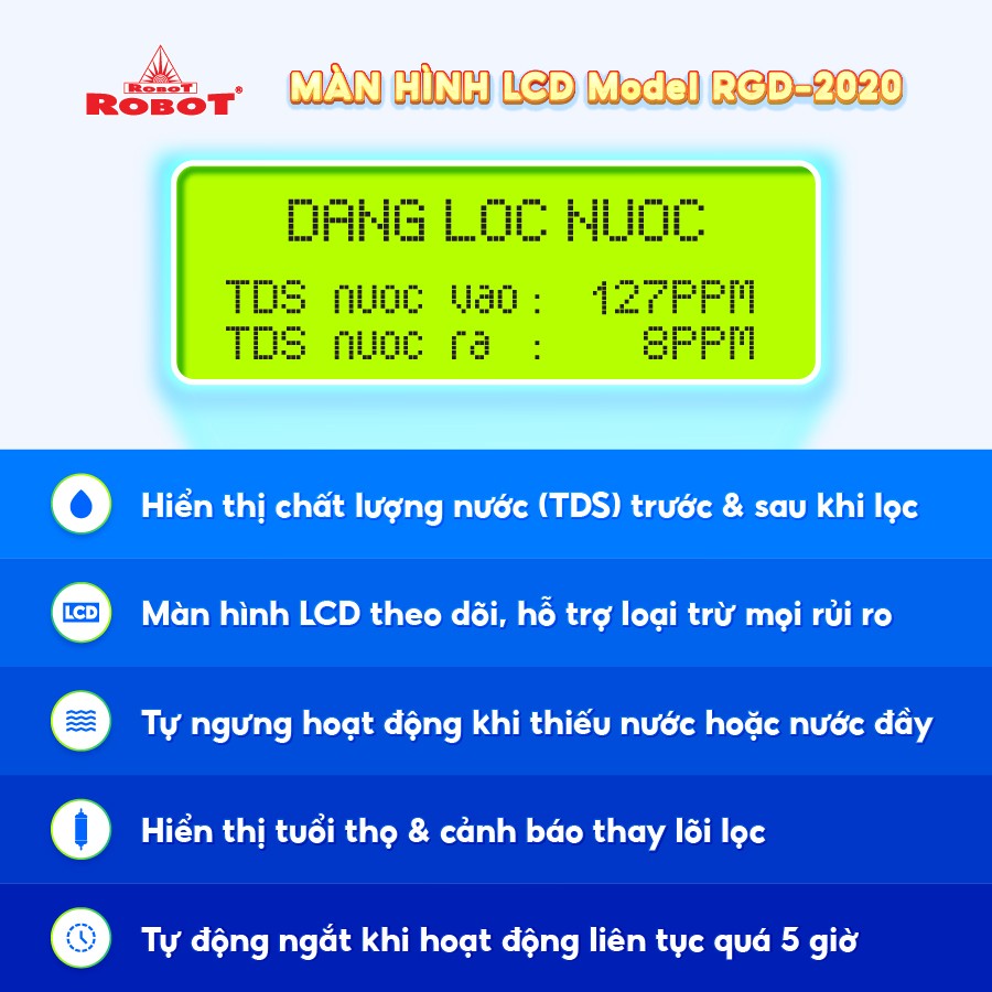 • Công nghệ RMC – LCD độc quyền, biết được chất lượng nước trước & sau lọc   Bộ vi mạch RMC-LCD thông minh thiết kế phát minh của ROBOT, mọi chi tiết vận hành máy được hiển thị trên màn hình LCD, cảnh báo mọi rủi ro cho người sử dụng   Tuổi thọ lõi lọc được tính theo lưu lượng nước sử dụng, không tính theo thời gian ghim điện như các máy thông thường, tiết kiệm tối đa chi phí thay lõi lọc