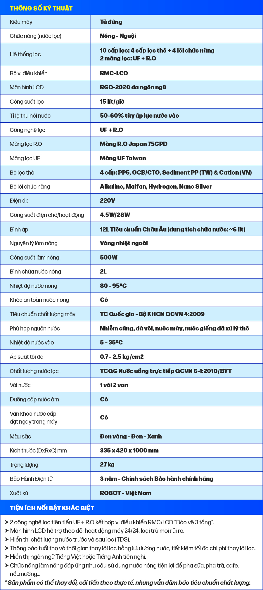- Máy lọc nước Nóng – Nguội ROBOT SPRING PRO 410GH-UR thuộc dòng Máy lọc nước thế hệ mới của ROBOT, duy nhất trên thị trường sử dụng công nghệ “Bảo vệ 3 tầng” gồm 2 màng lọc UF + R.O & vi điều khiển RMC/LCD, hỗ trợ người dùng trực tiếp kiểm soát chất lượng nước trước & sau lọc, cảnh báo rủi ro trong quá trình sử dụng.