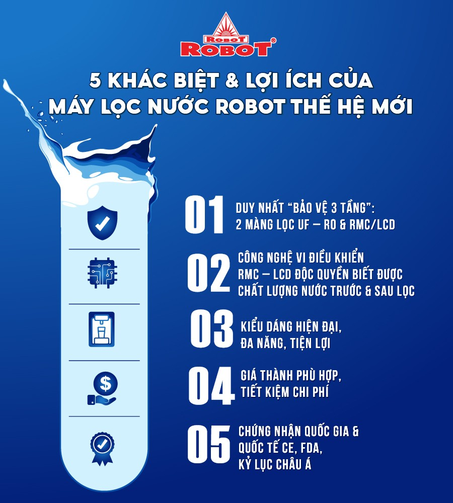 - Máy lọc nước ROBOT SPRING PRO 9G-UR thuộc dòng Máy lọc nước thế hệ mới của ROBOT, duy nhất trên thị trường sử dụng công nghệ “Bảo vệ 3 tầng” gồm 2 màng lọc UF + R.O & vi điều khiển RMC/LCD, hỗ trợ người dùng trực tiếp kiểm soát chất lượng nước trước & sau lọc, cảnh báo rủi ro trong quá trình sử dụng.
