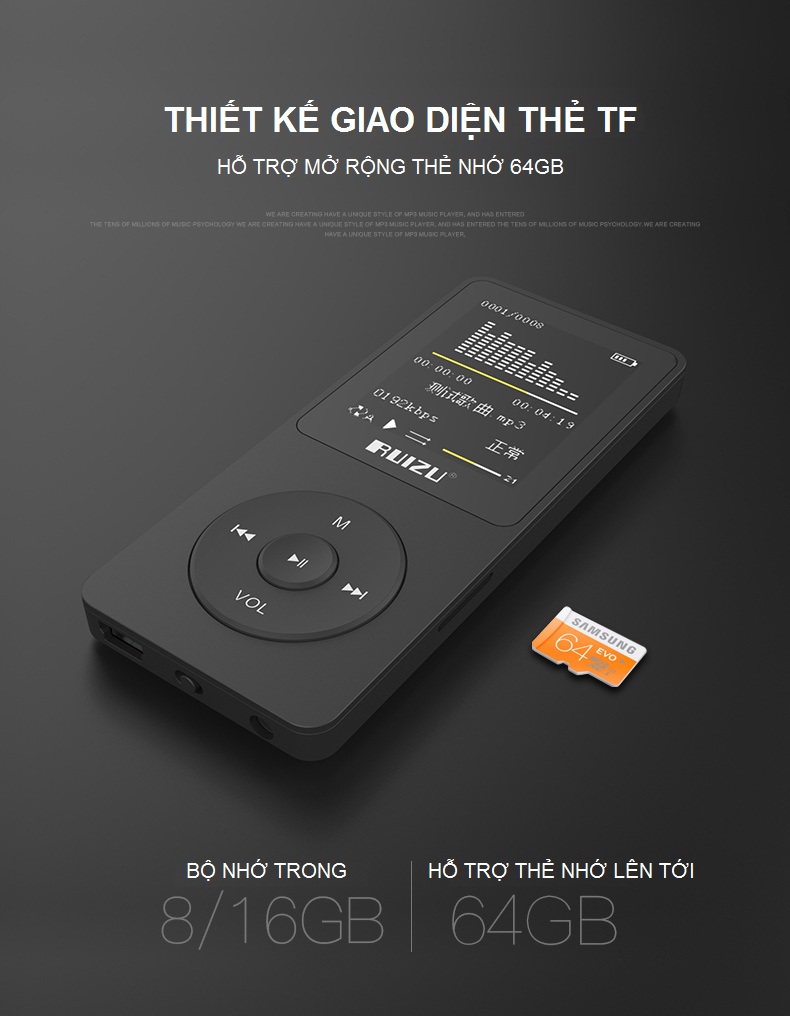 Máy Nghe Nhạc Lossless Ruizu X02 Bản 8Gb   RUIZU X02 là máy nghe nhạc mp3 hỗ trợ nghe nhạc, FM radio, xem video, ghi âm và đọc sách, với bộ nhớ trong 8G và khe thẻ nhớ ngoài tới 64GB giúp bạn thoải mái lưu trữ hàng ngàn bản nhạc và video ưa thích. THÔNG TIN SẢN PHẨM RUIZU X02 hỗ trợ nghe nhạc và FM, xem video và hình ảnh, ghi âm giọng nói, radio hay đọc sách ebook. Âm thanh hay và trung thực với 7 chế độ âm thanh tùy chỉnh. Bộ nhớ trong 8G và khe cắm thẻ nhớ ngoài tới 64GB. Pin sạc lithium dung lượng lớn hoạt động liên tục tới 70h. Thời gian sạc: 3-4h. Máy nghe nhạc mp3 sử dụng jack tai nghe chuẩn 3.5mm. Định dạng file âm thanh: MP3(MP1,MP2,MP3),WMA,OGG,WAV,APE,FLAC,AAC-LC,ACELP.  Định dạng file video: AMV Định dạng file e-book: TXT.Định dạng file hình ảnh: BMP, JPEG, JPG với độ phân giải 160 x 128.Đa ngôn ngữ: Tiếng Anh, Tiếng Pháp, Tiếng Ý, Tiếng Hàn, Tiếng Trung. BỘ SẢN PHẨM BAO GỒM 01 Máy nghe nhạc mp3 RUIZU X02 01 Dây sạc USB 01 Tài liệu sản phẩm (SẢN PHẨM KHÔNG KÈM TAI NGHE) THÔNG SỐ KỸ THUẬT Chipset Rockchip NANOB Màn hình 1.8inch (160x128px) Bộ nhớ trong 8GB Hỗ trợ thẻ nhớ ngoài lên đến 64GB Thời gian sử dụng 70h Thời gian sạc 3-4h Âm thanh AAC-LC, ACE-LP, APE, MP3, WAV, WMA Video AMV Hình ảnh BMP, JPEG, JPG E-book TXT Ghi âm WAV FM radio 87.5~ 108MHz Pin Pin trong Lithium Input AC 110 ~ 240V, 50 / 60Hz, Max 100mA  Output DC 5.0 ~ 5.5 V 500mA ~ 800mA Kích thước 9 x 3,8 x 0,6 cm Khối lượng 500g