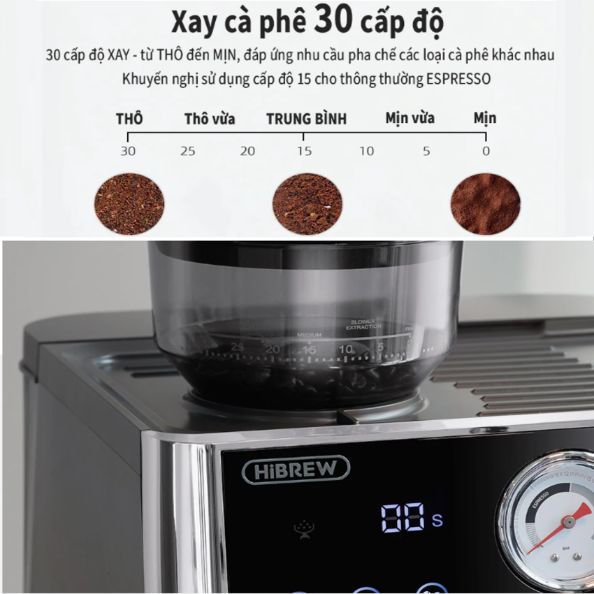- Pha cà phê espresso, xay hạt, tạo bọt sữa và đồng hồ do áp suất 3 trong 1