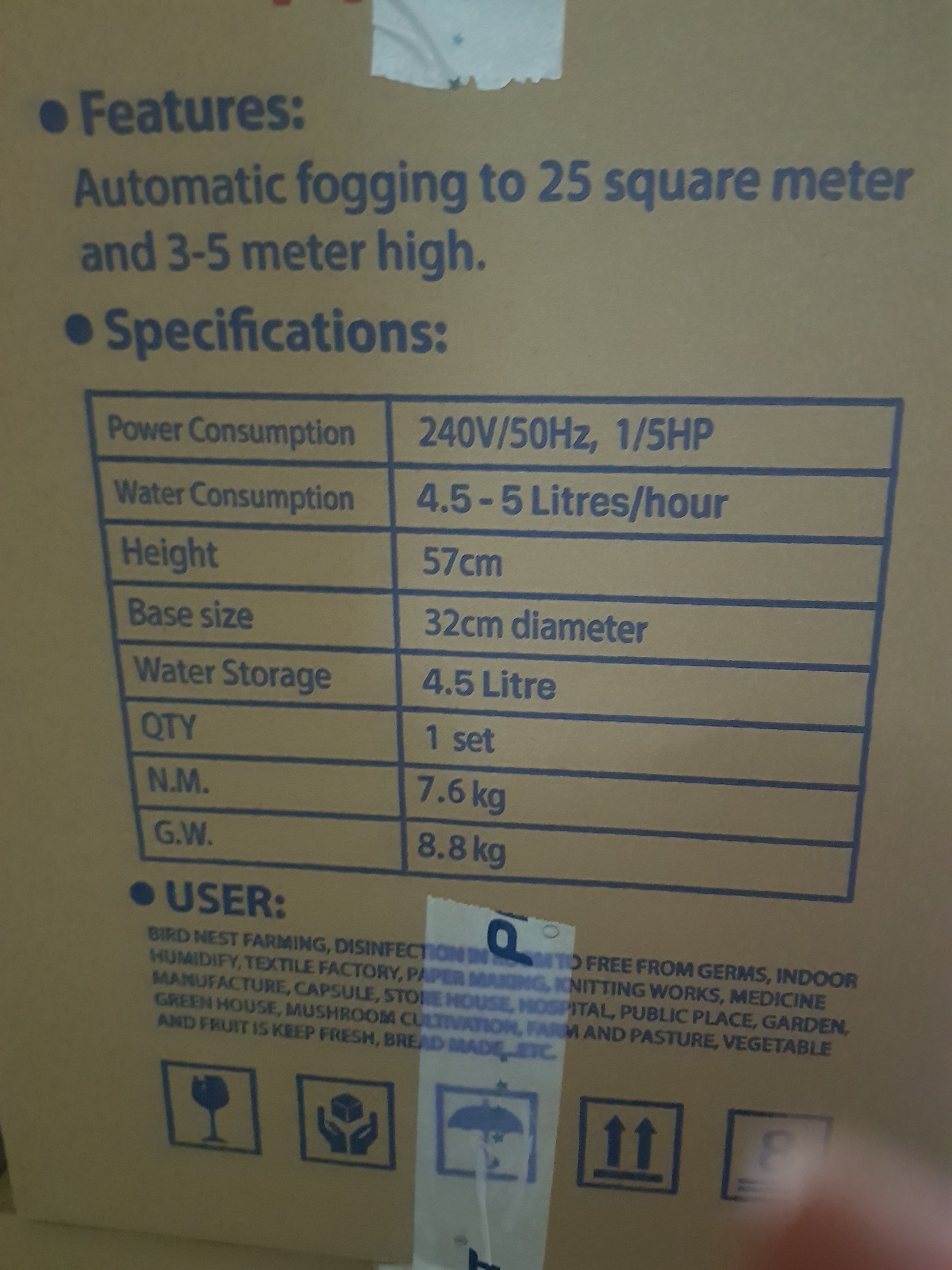 Thông số Nặng: 7,6 Kg Chất liệu: nhựa nguyên chất Phụ kiện kèm theo: 1 nón 3 hướng , 1 nắp lưới, 1 bộ chắn, 1 phao Công dụng: chuyên dụng cho nhà yến diện tích nhỏ, phòng khử trùng, làm ẩm trong nhà, nhà máy dệt, xưởng máy, các xưởng dêt nhà kho, dùng trong các vườn, nông trại chăn nuôi , trông trọt, các lò bánh mì, Ưu điểm: