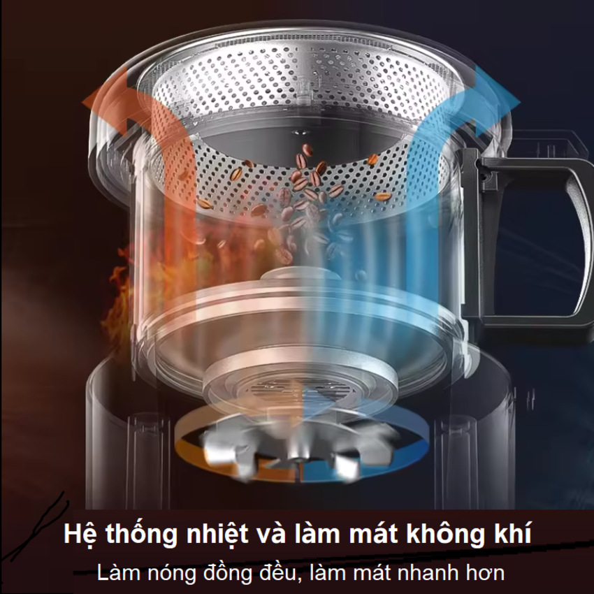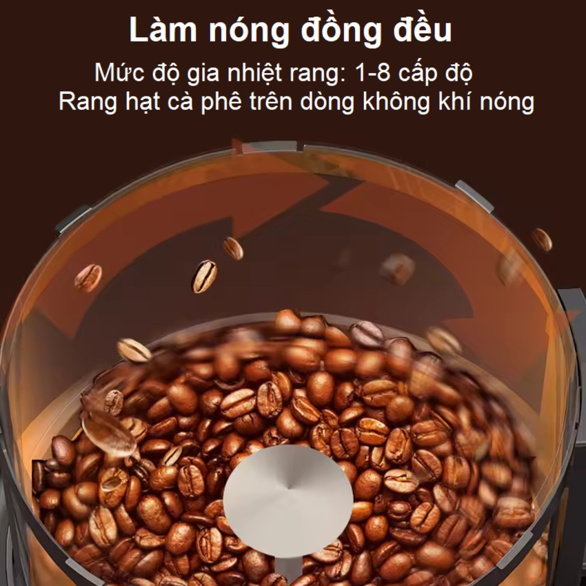 - Núm cài đặt hẹn giờ (1-15 phút) có thể điều chỉnh và làm nóng rang (1-8 cấp), nhiệt độ tự động không đổi, đảm bảo làm nóng đều khi rang. Máy rang cà phê thiết kế chuyên nghiệp