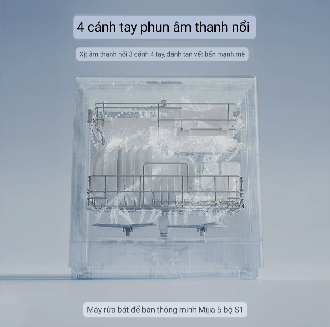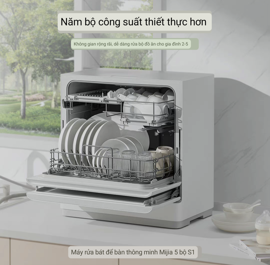 Máy rửa bát để bàn thông minh Mijia S1 có chiều sâu thân máy chỉ là 350mm và chiều rộng thân máy là 550mm, chiếm khoảng 0,19 mét vuông mặt bàn; nó có thể rửa 5 bộ đồ ăn tiêu chuẩn cùng một lúc, tổng cộng là 39 mảnh của bộ đồ ăn .