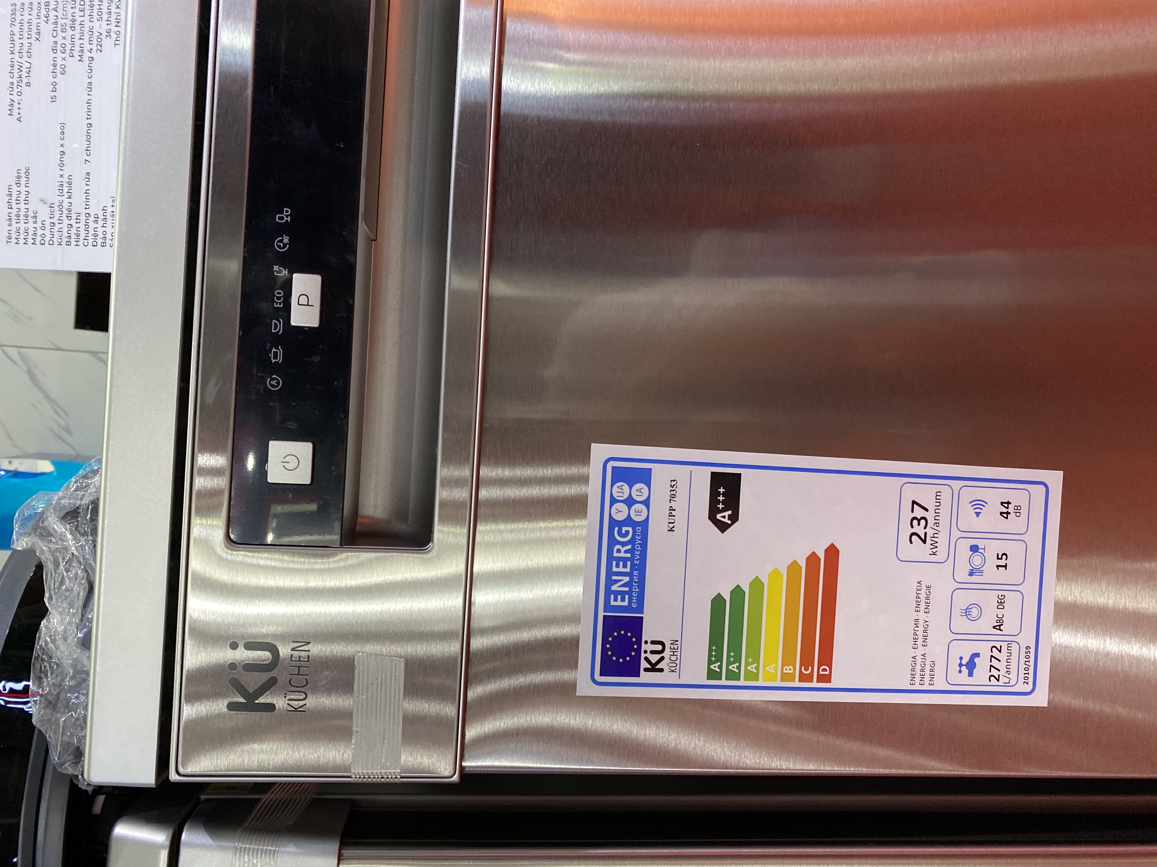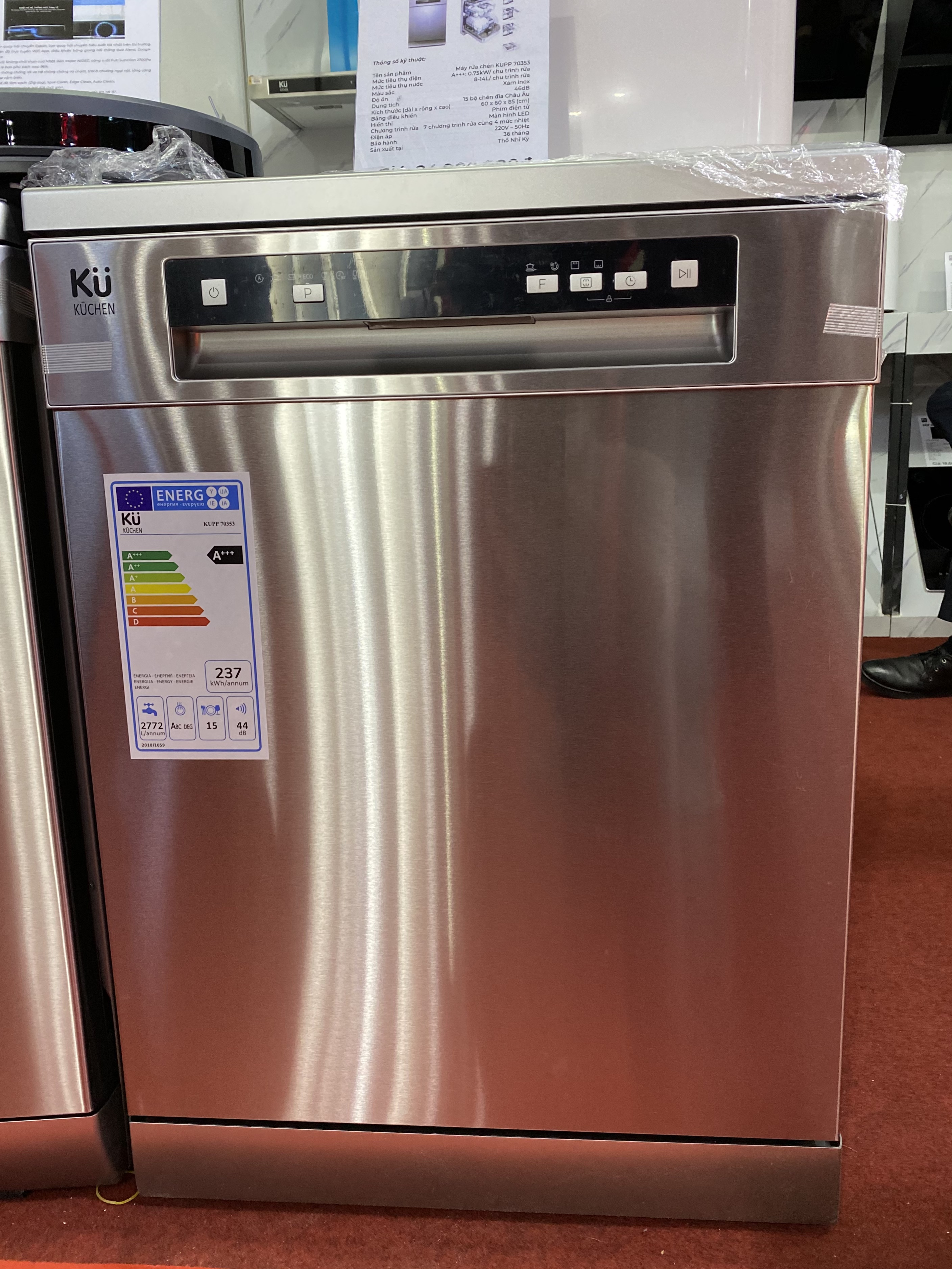 Máy rửa bát KUPP New 70353 với dung tích có thể rửa lên đến 15 bộ chén đĩa, cùng với xoong nồi, thớt, chảo rán… Cùng với đó là 3 tầng rửa có thể điều chỉnh kích thước, đem đến sự tiện lợi và thoải mái cho người sử dụng. Bảng điều khiển phím điện tử; hiển thị đèn chức năng với phím bấm to và rõ, bố trí thông minh và hợp lý, tạo cảm giác thân thiện cho bất cứ ai cũng có thể dễ dàng sử dụng và điều khiển. 7 chương trình rửa cùng 4 mức nhiệt độ rửa khác nhau nhằm tối ưu hóa công đoạn rửa, cho bát đĩa luôn sạch sẽ, hợp vệ sinh, rửa trôi các thực phẩm, hóa chất tồn dư đọng lại trên bát đĩa, diệt sạch vi khuẩn, virus, an toàn hơn so với khi rửa bằng tay theo cách thông thường. Chế độ hẹn giờ 24 tiếng giúp khách hàng luôn linh hoạt, chủ động trong việc sắp xếp thời gian. Hẹn giờ hoạt động vào ban đêm là một lời khuyên thực sự hữu ích cho những ai thích tận hưởng sự yên tĩnh và tiện dụng nhưng không có quỹ thời gian chăm sóc bản thân: