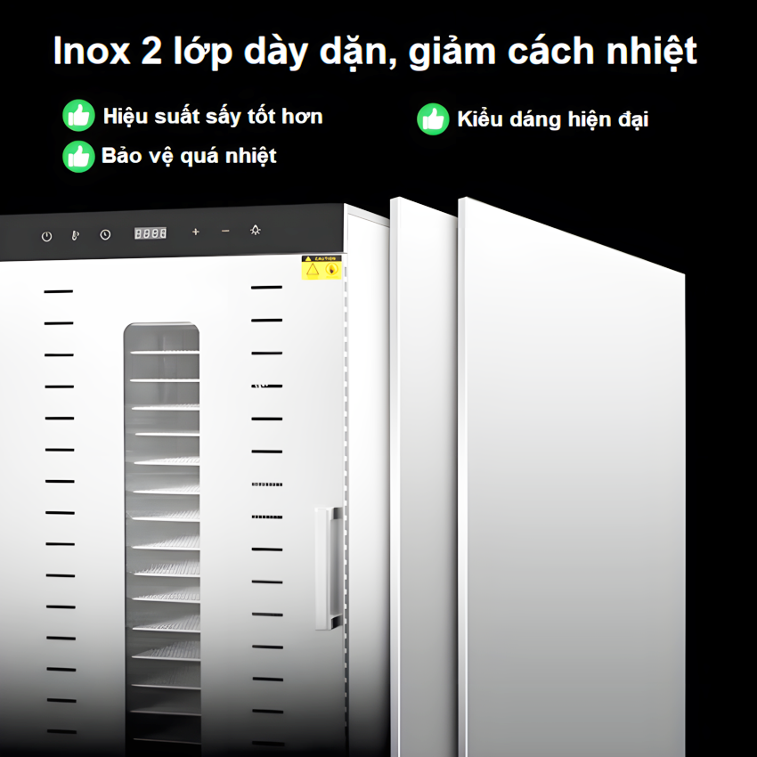 - Máy sấy thực phẩm 24 khay, sử dụng hệ thống gia nhiệt vô cùng thông minh và tự động. Toàn bộ 24 khay được gia nhiệt đều 360 độ tự động hoàn toàn giúp dòng khí được gia nhiệt thổi và phân phối khí đều các mặt, tiếp cận trực tiếp từng khay thực phẩm từ đa hướng