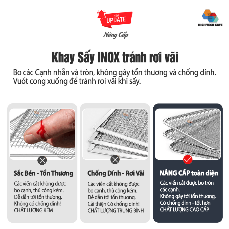 Mua tại TiktokMáy sấy thực phẩm inox HTG-ST01 Sấy khô hoa quả, trái cây, thịt cá rau củ, đa năng Tiện ích nhỏ gọn cho mỗi gia đình Việt, tự tay chế biến các món ăn ngon từ hoa quả sấy, thịt sấy cho các thành viên hay đồ ăn cho thú cưng một cách tiết kiệm và healthy. Một sự nâng cấp triệt để cho các máy thông thường, với chất lượng tuyệt vời hơn với độ gia công kĩ thuật cao hơn. Máy sấy thực phẩm inox HTG-ST01 là phiên bản được trang bị khay sấy INOX 304 chống dính, tránh rơi vãi láng bóng rất tiện lợi Đặc điểm nổi trội: Máy sấy thực phẩm inox HTG-ST01
