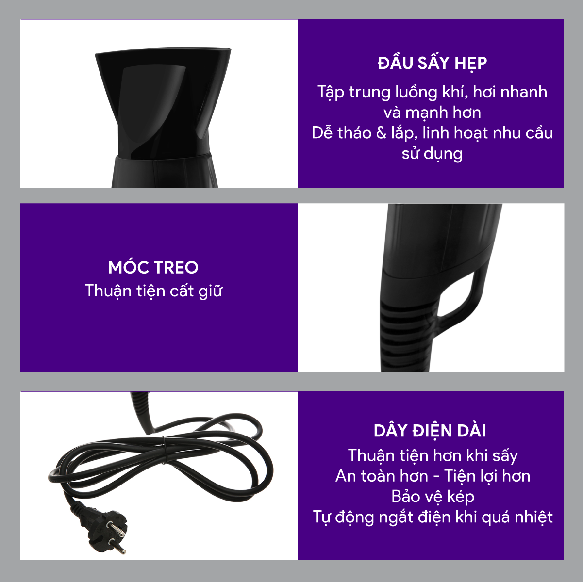 thiết kế đẹp với vẻ ngoài chắc chắn, màu đen sang trọng, khối lượng 850g, kích cỡ nhỏ gọn, sấy tóc dễ di chuyển, không lo mỏi tay Sử dụng an toàn với tính năng ,