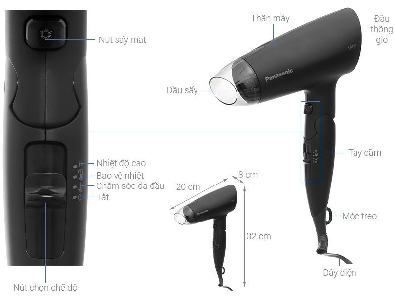 Máy sấy tóc Panasonic với thiết kế nhỏ gọn, dễ cầm nắm cùng công suất hoạt động mạnh mẽ 1800W giúp tóc nhanh khô, tiết kiệm thời gian sấy tóc Có 2 tốc độ