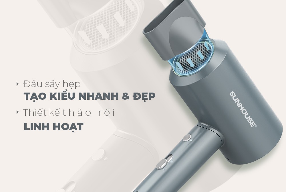 - Thiết kế sang trọng, hiện đại Máy sấy tóc SUNHOUSE SHD2315 làm từ nhựa PC siêu bền, chống bám bụi tốt giúp sản phẩm luôn sáng bóng như mới. Kiểu dáng hiện đại, đầm tay, gam màu xanh tối giản tạo cảm giác sang trọng, cao cấp. Sản phẩm được thiết kế đầu sấy hẹp giúp luồng gió mạnh và tập trung, giúp tạo được nhiều kiểu tóc một cách dễ dàng và nhanh chóng hơn. Đặc biệt đầu sấy này còn được thiết kế để người sử dụng có thể tháo lắp linh hoạt tùy theo nhu cầu, vô cùng tiện lợi. Tấm tản nhiệt phía sau là một bộ phận quan trọng của máy sấy tóc. SUNHOUSE SHD2315B được trang bị tấm tản nhiệu bằng hợp kim siêu bền, máy sấy hút gió tối ưu mà ít làm nóng sản phẩm, nhờ vậy giúp nâng cao tuổi thọ để máy được lâu bền hơn. Nút gạt nhẹ nhàng, thay đổi nhiệt độ linh hoạt Sản phẩm sử dụng nút gạt lên xuống để điều chỉnh tốc độ gió và mức nhiệt theo nhu cầu sử dụng. Chế độ gió nóng mặc định, nếu muốn đổi chế độ gió mát, bạn chỉ cần ấn nút có sẵn trên tay cầm. SẤY KHÔ NHANH & BẢO VỆ TÓC