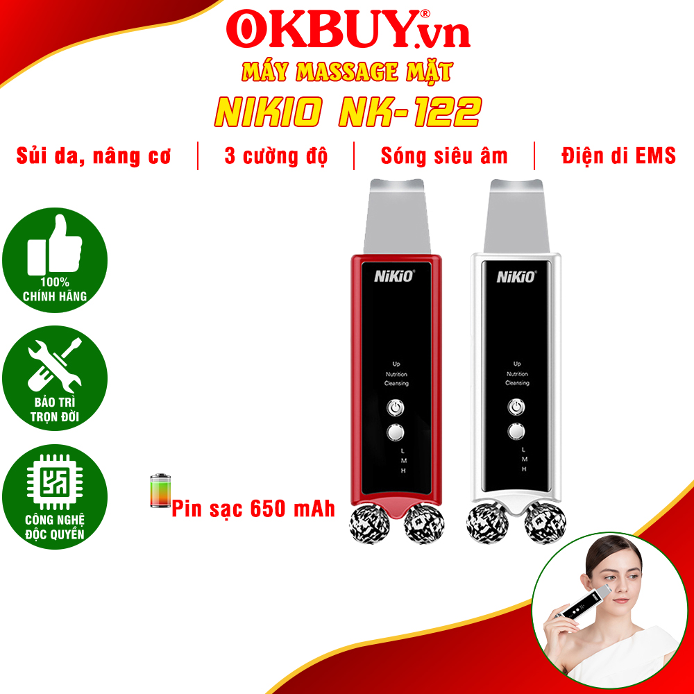 Mua tại TiktokMáy sủi da làm sạch tế bào chết kết hợp nâng cơ mặt Nikio NK-122 - 2in1, kết hợp công nghệ điện di EMS cải tiến mới cho da mặt săn chắc hơn Làm sạch tế bào chết và massage mặt là một trong những bước không thể thiếu trong quá trình skincare. Vì vậy, lựa chọn cho mình chiếc máy sủi da làm sạch tế bào chết Nikio NK-122 giúp cho chị em chăm sóc da mặt mình một cách hoàn hảo. Một trong 4 chức năng nổi bật của máy là: Làm sạch, đẩy tinh chất, làm săn chắc da, nâng cơ mặt. Đặc điểm nổi bật của máy nâng cơ mặt kết hợp sủi da làm sạch tế bào chết Nikio NK-122