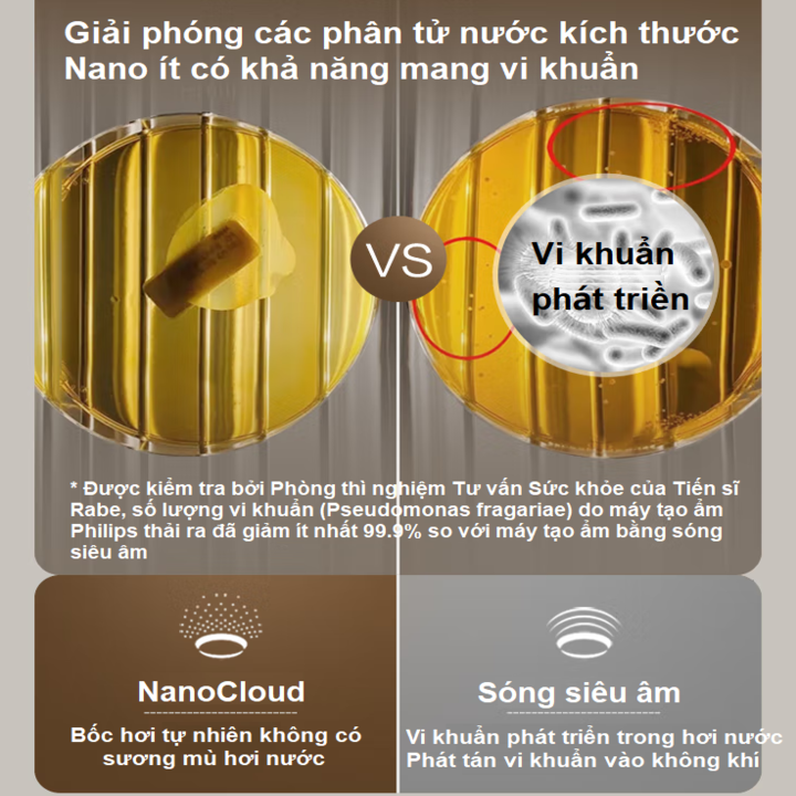 - Những hạt nước với kích cỡ nano nhờ công nghệ xông hơi NanoCloud sẽ giúp giảm đi 99% vi khuẩn trong phòng. -️ Không khí ẩm được phân bổ 360 độ đồng đều và khắp căn phòng. -️ Máy làm ẩm của Philips cho phép bạn lựa chọn độ ẩm từ 40, 50 và 60% cho sự thoải mái tối đa. -️ Chế độ tự động sử dụng cảm biến số để liên tục theo dõi độ ẩm. Nó điều chỉnh việc tạo độ ẩm lên và xuống khi cần thiết, đảm bảo độ ẩm luôn ở chế độ đã được chọn trước. - Đèn báo màu đỏ cho bạn biết bồn chứa nước cần được làm đầy. -️ Khi bồn chứa nước cạn, máy sẽ tự động tắt. -️ Chức năng hẹn giờ: 1/4/8 tiếng. Khi kết thúc thời gian hẹn giờ máy sẽ tự động tắt. -️ Chế độ ngủ ban đêm đảm bảo cho bạn không bị làm phiền bởi tiếng ồn của máy. Máy sẽ hoạt động với độ ồn tối thiểu, tất cả các đèn báo đều tắt ngoại trừ đèn báo tốc độ. -️ Có 3 chế độ lựa chọn tốc độ làm ẩm: thấp, bình thường và nhanh.