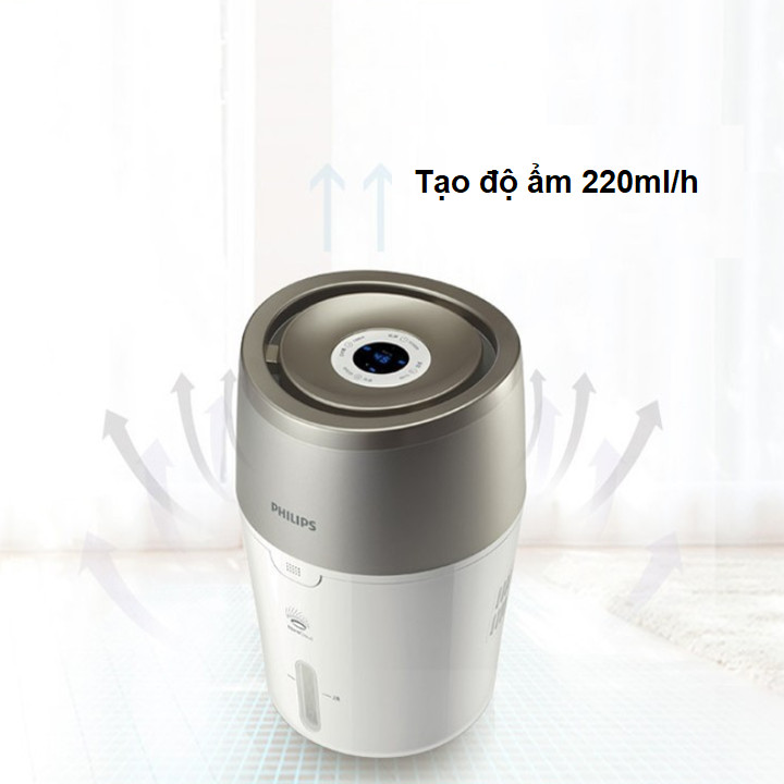 - Những hạt nước với kích cỡ nano nhờ công nghệ xông hơi NanoCloud sẽ giúp giảm đi 99% vi khuẩn trong phòng. -️ Không khí ẩm được phân bổ 360 độ đồng đều và khắp căn phòng. -️ Máy làm ẩm của Philips cho phép bạn lựa chọn độ ẩm từ 40, 50 và 60% cho sự thoải mái tối đa. -️ Chế độ tự động sử dụng cảm biến số để liên tục theo dõi độ ẩm. Nó điều chỉnh việc tạo độ ẩm lên và xuống khi cần thiết, đảm bảo độ ẩm luôn ở chế độ đã được chọn trước. - Đèn báo màu đỏ cho bạn biết bồn chứa nước cần được làm đầy. -️ Khi bồn chứa nước cạn, máy sẽ tự động tắt. -️ Chức năng hẹn giờ: 1/4/8 tiếng. Khi kết thúc thời gian hẹn giờ máy sẽ tự động tắt. -️ Chế độ ngủ ban đêm đảm bảo cho bạn không bị làm phiền bởi tiếng ồn của máy. Máy sẽ hoạt động với độ ồn tối thiểu, tất cả các đèn báo đều tắt ngoại trừ đèn báo tốc độ. -️ Có 3 chế độ lựa chọn tốc độ làm ẩm: thấp, bình thường và nhanh.