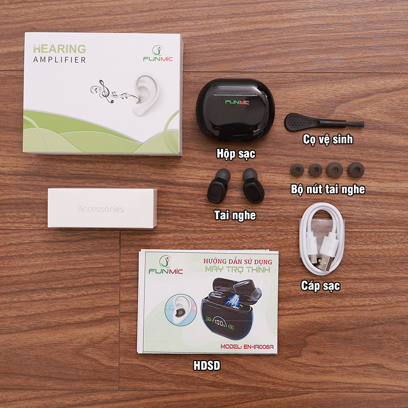Sản phẩm đạt chất lượng ISO13485,CE、RoHS Ưu điểm của tai nghe trợ thính không dây Funmic EN-IA006A: Âm thanh tái tạo sắc nét Tai nghe trợ thính Funmic EN-IA006A được trang bị chip xử lý âm thanh hiện đại, giúp tái tạo âm thanh một cách sắc nét và trung thực. Nhờ công nghệ tiên tiến, người dùng có thể nghe rõ từng âm thanh với độ chính xác cao, dù là trong môi trường ồn ào hay yên tĩnh. Lọc bỏ tiếng ồn ≤29dB Với khả năng lọc bỏ tiếng ồn ≤29dB, tai nghe này giúp loại bỏ hiệu quả các tạp âm không mong muốn từ môi trường xung quanh, cho phép người dùng nghe rõ hơn các âm thanh quan trọng của cuộc trò chuyện hay âm thanh từ cuộc sống. Độ méo tiếng cực nhỏ 5% Một trong những ưu điểm nổi bật của máy trợ thính không dây Funmic EN-IA006A là độ méo tiếng rất thấp, chỉ 5%. Đảm bảo chất lượng âm thanh gần với âm thanh thực tế nhất, mang lại cảm giác nghe dễ chịu và tự nhiên. Mạch khuếch đại Class D Tai nghe trợ thính Funmic EN-IA006A sử dụng mạch khuếch đại Class D, cho hiệu suất cao và tiết kiệm năng lượng. Điều này giúp âm thanh được khuếch đại mạnh mẽ, rõ ràng mà không tiêu tốn quá nhiều pin. Ghi nhớ âm lượng thông minh Với chức năng ghi nhớ âm lượng, người dùng không cần điều chỉnh lại mức âm lượng sau mỗi lần tắt máy. Tai nghe trợ thính Funmic EN-IA006A sẽ tự động ghi nhớ và điều chỉnh theo cài đặt trước đó, giúp tiết kiệm thời gian và tạo sự tiện lợi. Khử tiếng hú, tiếng gió hiệu quả Chức năng lọc tiếng hú nhanh kết hợp với bộ lọc âm thanh có thể chặn tiếng hú, tiếng gió hiệu quả. Thiết kế này giúp mang lại trải nghiệm nghe thoải mái, không gây cảm giác khó chịu cho tai, đặc biệt khi sử dụng ngoài trời hoặc trong môi trường nhiều tiếng động. Độ trễ âm thanh <15ms Với độ trễ âm thanh cực thấp chỉ <15ms, máy trợ thính Funmic EN-IA006A đảm bảo việc truyền âm thanh vào tai nhanh chóng. Điều này đặc biệt quan trọng khi giao tiếp, giúp người dùng không bị gián đoạn hoặc lỡ nhịp trong các cuộc trò chuyện. Âm thanh khuếch tán 360 độ Tai nghe trợ thính Funmic EN-IA006A hỗ trợ khuếch tán âm thanh 360 độ, giúp âm thanh được phân bổ đều khắp không gian nghe. Điều này mang lại cảm giác rõ ràng, sống động và giúp người dùng dễ dàng nhận diện âm thanh từ mọi phía. Nút tai silicon thân thiện với da Sản phẩm đi kèm 3 nút tai silicon mềm mại, thân thiện với da, đảm bảo sự thoải mái khi đeo trong thời gian dài mà không gây kích ứng hay đau tai. Thiết kế này phù hợp với nhiều kích thước tai khác nhau, giúp người dùng cảm thấy dễ chịu hơn khi sử dụng. Màn hình LED hiển thị % pin Tai nghe trợ thính Funmic EN-IA006A được trang bị màn hình kỹ thuật số, giúp người dùng dễ dàng quan sát % pin còn lại và có kế hoạch sạc pin kịp thời. Đây là tính năng tiện ích, giúp người dùng không bị gián đoạn trong quá trình sử dụng. Điều khiển cảm ứng vân tay Sản phẩm tích hợp bảng điều khiển cảm ứng vân tay, cho phép người dùng tùy chỉnh âm lượng một cách nhanh chóng và dễ dàng chỉ bằng những thao tác đơn giản. Thiết kế này mang lại sự hiện đại và tiện lợi khi sử dụng. Thời lượng pin dài 20 giờ Với thời lượng pin lên đến 20 giờ, tai nghe trợ thính Funmic EN-IA006A cho phép người dùng thoải mái sử dụng suốt cả ngày mà không cần lo lắng về việc hết pin. Đây là ưu điểm nổi bật giúp sản phẩm phù hợp với những người có nhu cầu sử dụng lâu dài. Thiết kế gọn nhẹ, đẹp mắt Sản phẩm có thiết kế gọn nhẹ, không gây nặng tai hay khó chịu khi đeo trong thời gian dài. Với trọng lượng siêu nhẹ và kiểu dáng hiện đại, người dùng có thể thoải mái mang theo tai nghe bất cứ lúc nào, bất cứ nơi đâu. Sạc chạm thông minh với hộp sạc Tai nghe trợ thính Funmic EN-IA006A đi kèm hộp sạc thông minh, giúp việc sạc pin trở nên nhanh chóng và tiện lợi. Hộp sạc này không chỉ giúp bảo vệ tai nghe mà còn đóng vai trò như một nguồn năng lượng dự phòng, đảm bảo tai nghe luôn sẵn sàng sử dụng. Đạt chứng nhận ISO13485, CE, RoHS Sản phẩm đạt các chứng nhận quốc tế như ISO13485, CE, và RoHS, đảm bảo chất lượng và an toàn cho người sử dụng. Những chứng nhận này khẳng định sản phẩm đáp ứng đầy đủ các tiêu chuẩn nghiêm ngặt về thiết bị y tế và thân thiện với môi trường. Đối tượng nào nên dùng máy trợ thính?