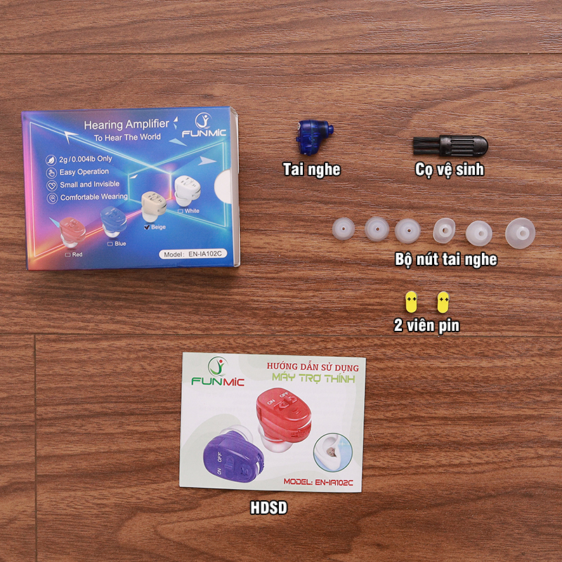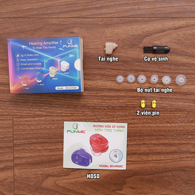 Không đeo máy trợ thính khi tắm, bơi lội, khi trời mưa to hoặc trong bầu không khí ẩm ướt như phòng tắm hơi. Thông số kỹ thuật của máy trợ thính Funmic EN-IA102C: Model: EN-IA102C Thương hiệu: Funmic Âm thanh khuếch đại tối đa: <112dB+3dB Âm thanh khuếch đại trung bình: 108dB±4dB Tăng âm thanh tối đa: 35dB±5dB Tăng âm thanh trung bình: 30dB±5dB Độ méo tiếng: ≤10% Dải tần số: F1≤400Hz, F2≥4600Hz Tiếng ồn đầu vào: ≤29dB+3dB Cường độ dòng điện: ≤2.5mA Loại pin: A10 Màu sắc: Be / đỏ / xanh dương Trọng lượng sản phẩm: 2g Kích thước sản phẩm: 16 x 16 x 10mm Kích thước đóng gói: 90 x 70 x 25 mm Trọng lượng đóng gói: 30g Số công bố của Sở Y Tế cấp: 240002566/PCBB-HCM Sản phẩm đạt giấy chứng nhận ISO13485, CE, RoHS Sản phẩm bao gồm: