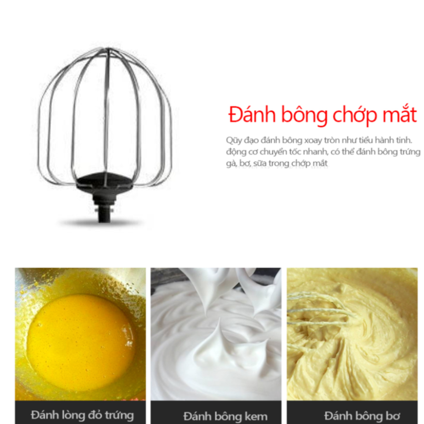 - Với 3 loại cây đánh đi kèm, máy không chỉ dùng trộn bột mà còn có thể đánh trứng, kem, nhồi bột và trộn nhân cùng nhiều nguyên liệu khác. Rất đa năng, tiện lợi cho người dùng