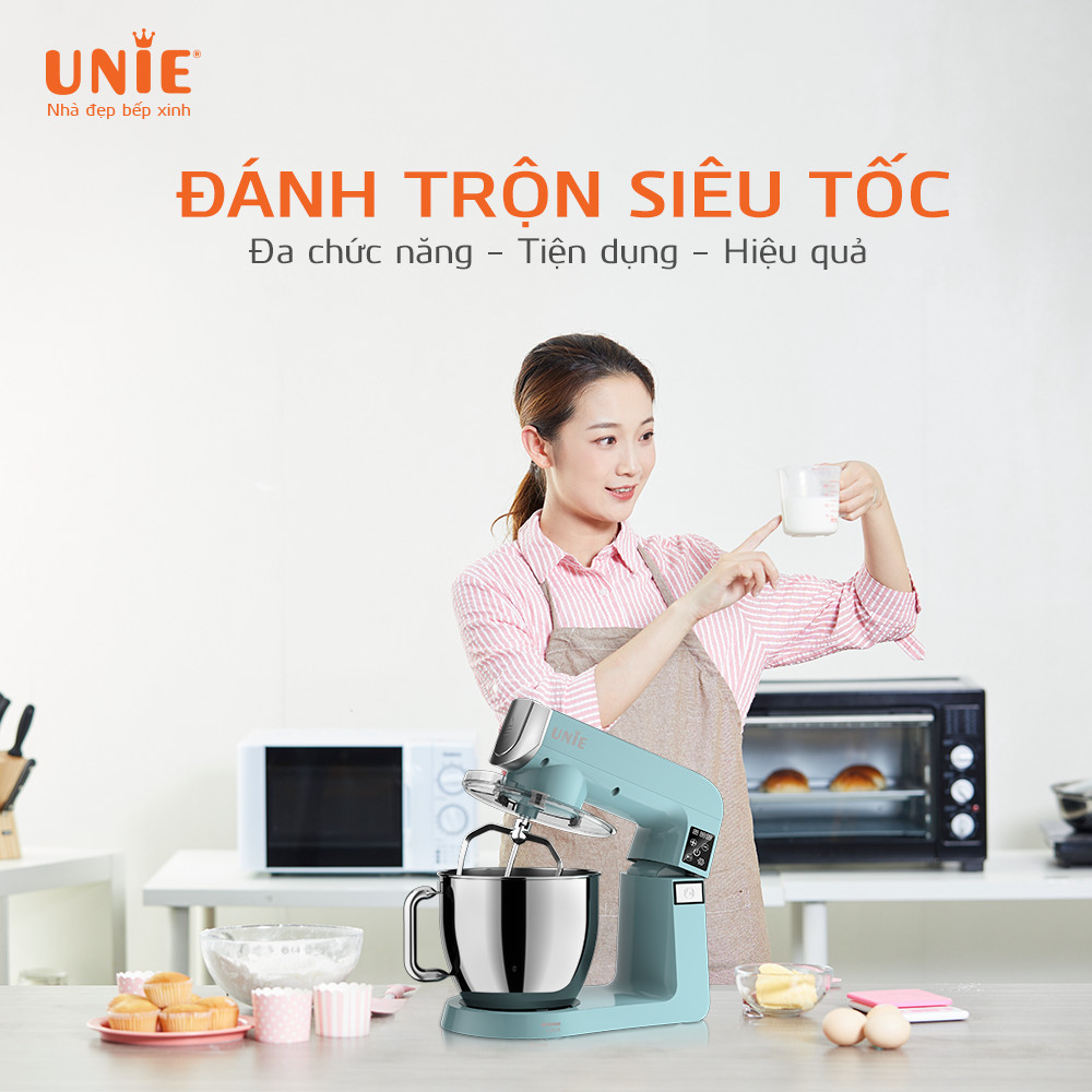 Máy nhồi bột đa năng UNIE UE-990 có các chức năng: nhồi bột, trộn thực phẩm, đánh trứng, đánh kem. UE-990 có 10 nấc tốc độ có thể điều chỉnh tốc độ theo yêu cầu, giúp thực phẩm đạt được chất lượng tốt hơn. Trang bị 3 bộ phụ kiện chính được làm bằng hợp kim kẽm không gỉ: Đầu nhồi bột, đầu đánh trộn và đầu đánh trứng. Ngoài ra, UNIE UE-990 dung tích lớn 6.5L thoải mái trộn lượng bột lớn phù hợp với những chị em đam mê làm bánh. ƯU ĐIỂM NỔI BẬT CỦA MÁY NHỔI BỘT UNIE UE-990 Công suất lớn 1800W cho thành phẩm bột mịn hơn Unie UE-990 sở hữu công suất 1800W giúp máy hoạt động mạnh mẽ, bền bỉ. Trộn được nhiều bột hơn, thành phẩm bột mịn mướt hỗ trợ bạn làm nên những mẻ bánh ngon nhất. Dung tích thố trộn 6.5L kết hợp với nắp chống văng thông minh Với dung tích thố trộn 6.5L bạn có thể đánh được 1000g bột khô thêm 538g nước trong 1 lần đánh. Thố trộn làm bằng chất liệu inox 304 sáng bóng, chống han gỉ rất an toàn. Ngoài ra, máy có thiết kế phần nắp chống văng thông minh nên bạn yên tâm là bột sẽ luôn nằm gọn trong thố không bị bắn ra ngoài trong quá trình đánh trộn. Chất liệu thân kim loại nguyên khối bền bỉ kết hợp lớp vỏ sơn tĩnh điện màu xanh pastel hiện đại, trẻ trung Phần thân máy sử dụng thân kim loại nguyên khối giúp tăng trải nghiệm người dùng. Ngoại hình UE-990 nhìn khỏe khoắn hơn và độ bền cao không lo tình trạng hoen gỉ khi sử dụng máy trong thời gian dài. Lớp vỏ được sơn tĩnh điện màu xanh pastel đậm chất vintage sẽ phù hợp với những bạn thích thiết bị nhà bếp vừa tiện dụng vừa là vật decor cho căn bếp thêm ấm cúng. Phụ kiện đa dạng, gồm 3 đầu đánh sử dụng linh hoạt Máy nhồi bột thế hệ mới Unie UE-990 có 3 đầu trộn linh hoạt dễ dàng tháo lắp và sử dụng gồm: đầu nhồi bột, đầu đánh trộn và đầu đánh trứng. 3 đầu phụ kiện đều được làm chất liệu an toàn, chống han gỉ nên bạn yên tâm sử dụng. Màn hình LED hiển thị rõ ràng, cài đặt điều chỉnh thời gian linh hoạt Ngoài yếu tố ngoại hình băt mắt, Máy nhồi bột Unie UE-990 sở hữu bảng điều khiển cảm ứng hiện đại hiện thị thời gian, tốc độ đánh và tùy chỉnh cài đặt thời gian theo ý giúp hỗ trợ bạn tối đa trong quá trình làm bánh. Màn hình LED hiện thị các thông số thời gian, tốc độc to rõ ràng dễ quan sát. Chân đế cao su chắc chắn Thiết kế phân chân mút cao su giúp khi máy hoạt động ở công suất lớn nhất vẫn có thể bám chắc vào mặt bàn phẳng tăng tuổi thọ cho máy và tính an toàn của sản phẩm Vệ sinh dễ dàng Với vỏ ngoài được phủ sơn tĩnh điện và toàn bộ phụ kiện được làm bằng inox 304 sáng bóng, phụ kiện tháo dời linh hoạt nên việc vệ sinh máy rất dễ dàng. Với phụ kiện bạn làm sạch bằng dung dịch tẩy rửa thông thường. Với thân máy dùng khăn mềm lau sạch là được. Lưu ý không nhúng phần thân máy vào nước sẽ ảnh hưởng tới phần động cơ bên trong. THÔNG SỐ KỸ THUẬT TỔNG QUAN VỀ MÁY NHỒI BỘT UNIE UE-990 Máy nhồi bột đa năng là gì? Máy nhồi bột hay còn được gọi là máy đánh bột, máy trộn bột. Trước kia nếu muốn làm bánh, bạn phải tự tay nhào bột còn giờ đây sử dụng máy nhồi bột gia đình hay máy nhồi bột công nghiệp. Tại sao nên mua máy nhồi bột đa năng Với nhiều người thì máy nhồi bột còn khá là mới mẻ nên họ cũng có những băn khoăn không biết loại máy này có tốt không, nhồi bột có đều không? Vậy chúng ta hãy cùng xem những lý do để bạn chọn máy nhồi bột làm bánh nhé: