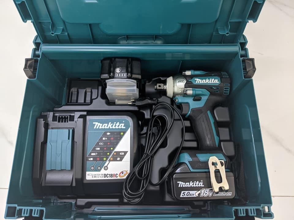 Trong hộp có: Máy siết bu lông, 2 pin 5.0Ah, 1 đế sạc nhanh DC18RC, 1 thùng đựng bằng nhựa