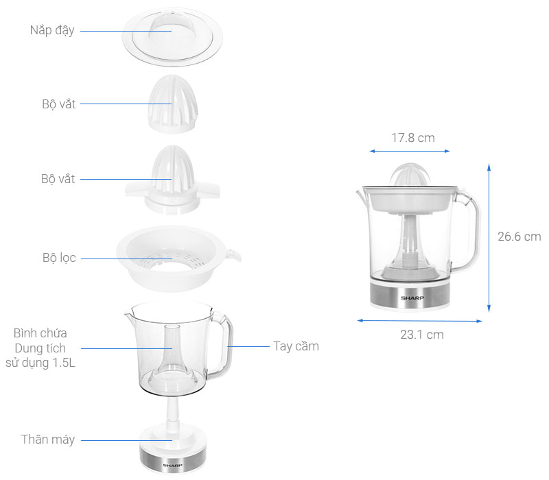 Máy vắt cam Sharp thiết kế gọn nhẹ, màu trắng sáng tươi trẻ, có tay cầm chắc chắn Chuyên dụng để vắt các loại hoa quả họ cam như cam, bưởi, quýt, chanh,… đáp ứng nhu