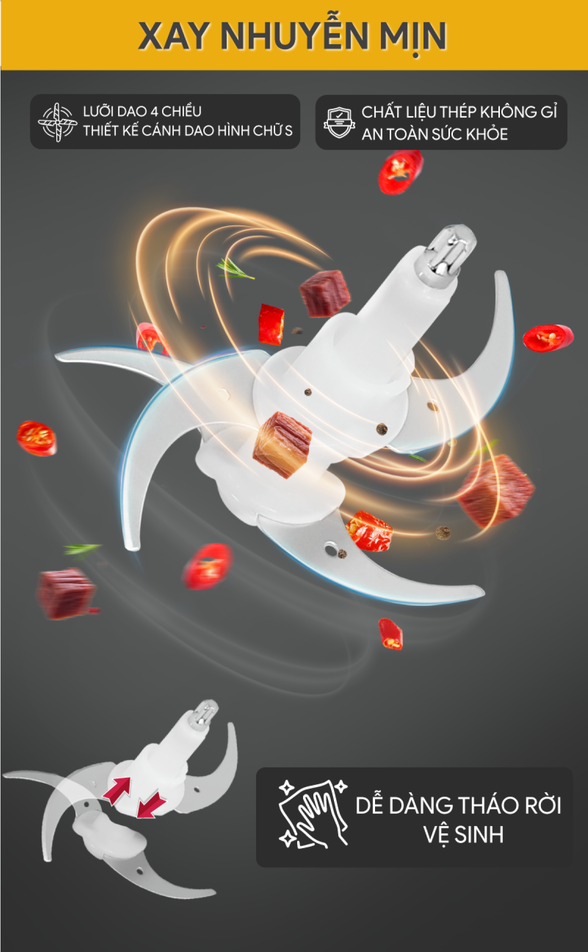 ️ ĐIỂM ĐẶC TRƯNG CỦA SẢN PHẨM - Thiết kế nhỏ gọn, dễ dàng cầm nắm khi sử dụng xay thực phẩm. - Dễ dàng xay nhuyễn thực phẩm với lưỡi dao sắc bén. -