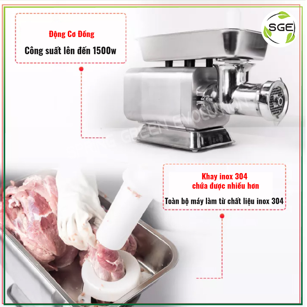 - Chuẩn bị khay để chứa thành phẩm sau khi xay ƯU ĐIỂM CỦA MÁY XAY THỊT MG TURBO Tốc độ tối đa lên tới 180 kg/h Bạn có thể xay gia vị, hành, tỏi hoặc làm xúc xích cũng không khó Đặc biệt có thể xay thịt đông lạnh không quá -5 độ -Các lưỡi dao sắc và khỏe, được thiết kế đặc biệt để xay mịn nhuyễn, dễ dàng nghiền nát cả sụn và gân Động cơ lõi đồng nguyên chất công suất lên đến 1500W, bền bỉ, việc nặng việc nhẹ cũng không ngại Sử dụng dễ dàng, phù hợp với nguồn điện dân dụng Toàn bộ máy làm từ chất liệu inox 304, kết cấu dày dặn, không rỉ sét, an toàn với thực phẩm 100% Tất cả các bộ phận có thể tháo rời để làm vệ sinh Sản phẩm có bảo hành, đảm bảo chất lượng với dịch vụ hẫu mãi sau bán hàng Máy xay thịt không tốn sức thích hợp cho sản xuất kinh doanh. Máy sẽ khiến bạn hoàn toàn hài lòng về chất lượng và sự an toàn. Sử dụng máy xay thịt chính là bí quyết tiết kiệm sức lao động trong kinh doanh, sử dụng tiện lợi, nhanh chóng, tiết kiệm thời gian với giá cả phải chăng. Làm xúc xích truyền thống dễ dàng, không tốn sức. Miễn phí! dụng cụ làm xúc xích Khay inox 304 chứa được nhiều hơn Có thể xay thịt đẹp mắt trộn đều thịt HÌNH ẢNH MỘT SỐ SẢN PHẨM DÙNG VỚI MÁY XAY THỊT MG TURBO CẤU TẠO CỦA MÁY XAY THỊT CÔNG NGHIỆP MG TURBO Máy xay thịt (Meat mincer) nguồn điện 220V tương thích với nguồn điện dân dụng, thiết bị chính bao gồm 7 bộ phận: