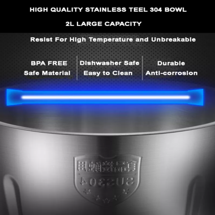 - Tốc độ II: Lưỡi dao quay nhanh thích hợp xay các thực phẩm cứng: Thịt, hạt cứng, cà rố Chất liệu cao cấp - Cối xay sử dụng inox 304 100% không làm biến đổi dinh dưỡng của thực phẩm, an toàn cho sức khỏe. Dung tích 2L, dễ dàng tháo lắp và lau chùi sau khi sử dụng