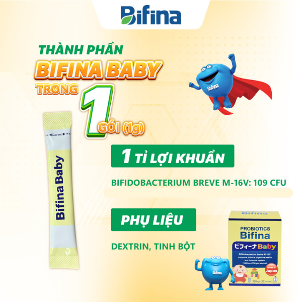 Mua tại TiktokMen vi sinh Bifina Baby Nhật Bản- Hộp 30 gói - Bổ sung lợi khuẩn cho bé hỗ trợ tiêu hoá khoẻ mạnh Đối tượng sử dụng: Dành cho trẻ em từ 0 tháng tuổi cần bổ sung lợi khuẩn cho hệ tiêu hóa khỏe mạnh. Công dụng : Bổ sung lợi khuẩn, giúp hệ vi sinh đường ruột khỏe mạnh, hỗ trợ tiêu hóa và tăng cường sức đề kháng. Thành phần mỗi gói (1g):
