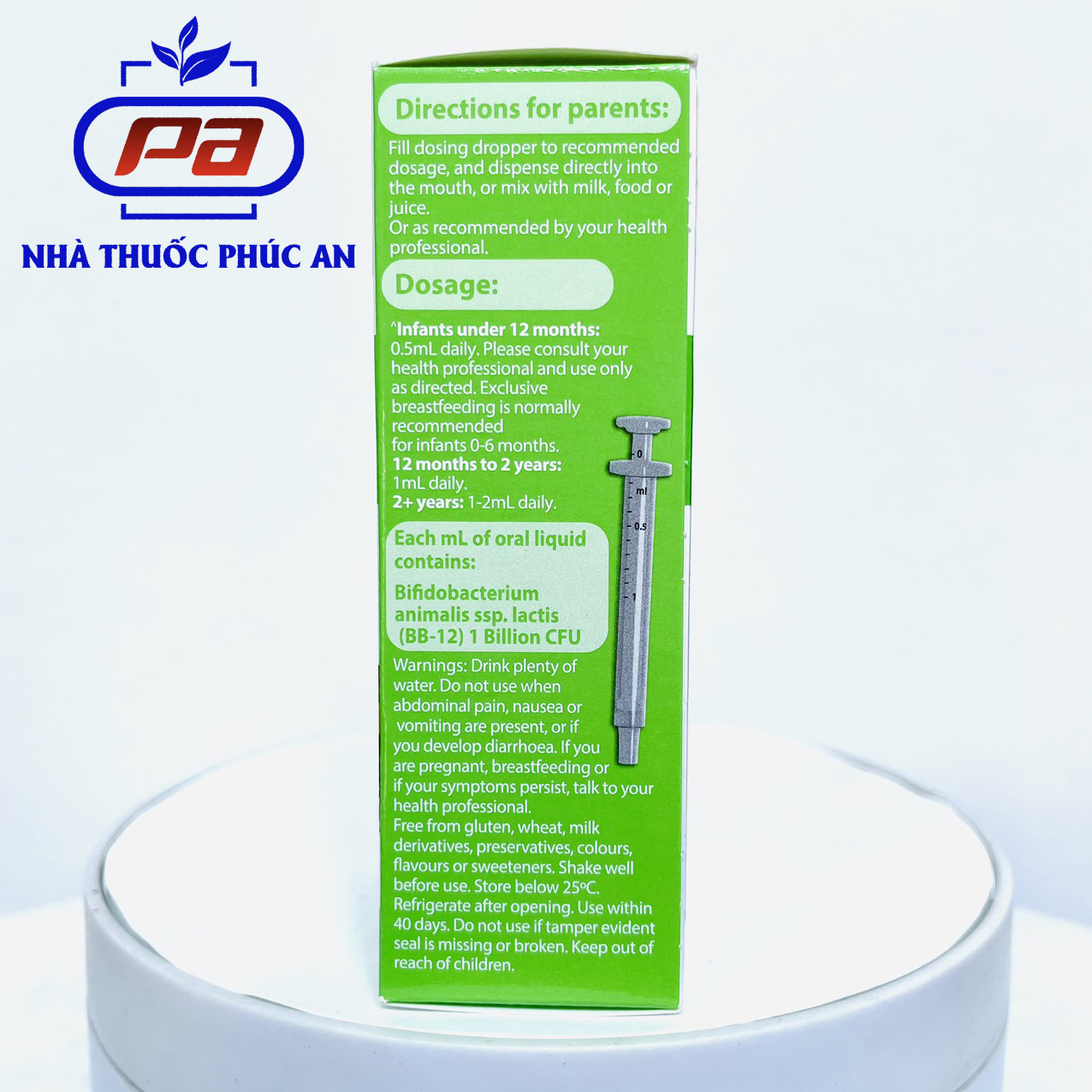 - Cân bằng hệ vi khuẩn đường ruột. THÀNH PHẦN CHÍNH: Mỗi ml Probiotic chứa lợi khuẩn Bifidobacterium 1 tỷ CFU (BB-12). Đây chính là chìa khóa để giải quyết hầu hết vấn đề liên quan đến hệ tiêu hóa của bé, đặc biệt là táo bón. Lợi khuẩn Bifidobacterium(Bifido) là lợi khuẩn chính yếu chiếm 99% lợi khuẩn của đường ruột, cư trú chủ yếu ở cuối ruột non và ruột già (đại tràng), có vai trò quan trọng trong hệ trong tiêu hóa của bé. HƯỚNG DẪN SỬ DỤNG: