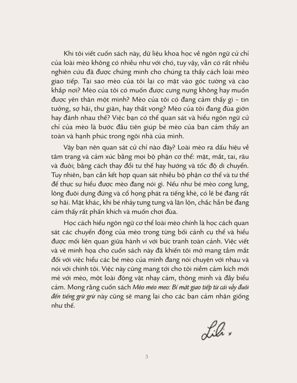Với những tài liệu khoa học đầy thú vị cùng kinh nghiệm thực tiễn khi gắn bó với hai chú mèo cưng Mambo & Shimmy, tác giả Lili Chin khẳng định rằng: Mèo là loài sinh vật cực kỳ linh hoạt về mặt xã hội, gắn bó với chủ nhân (giống y như cách mèo con gắn kết với mèo mẹ) và có những cách riêng để bày tỏ sự cảm mến, tin cậy, hoặc nhu cầu cần “khoảng riêng tư một mình.”